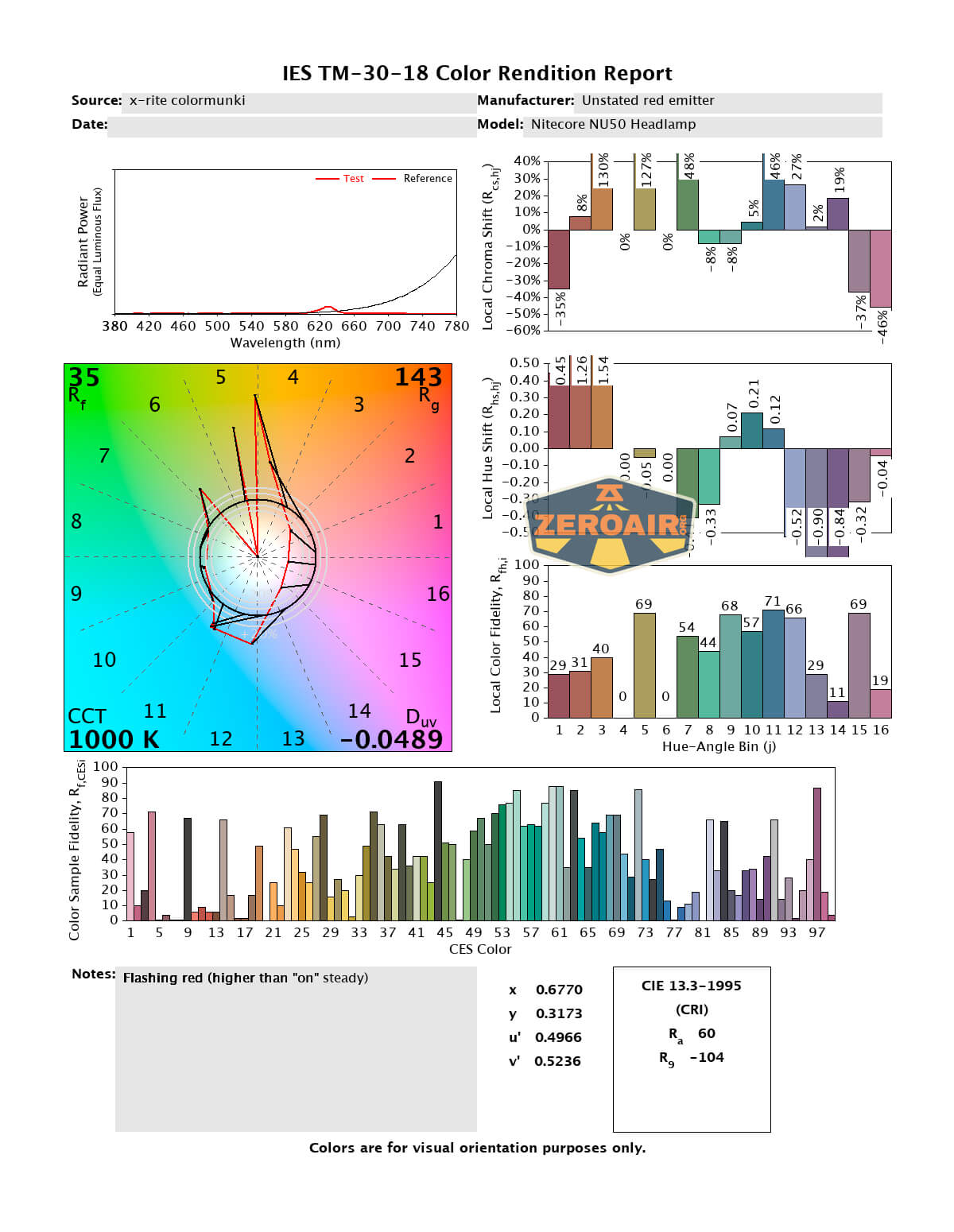 CCT ranges from around 5400K to around 5900K, which is fairly reasonable for Neutral to Cool white. The CRI is low, at around 70. The right two photos are both red – red has two levels, but the higher level is blinky only. I captured that here anyway.