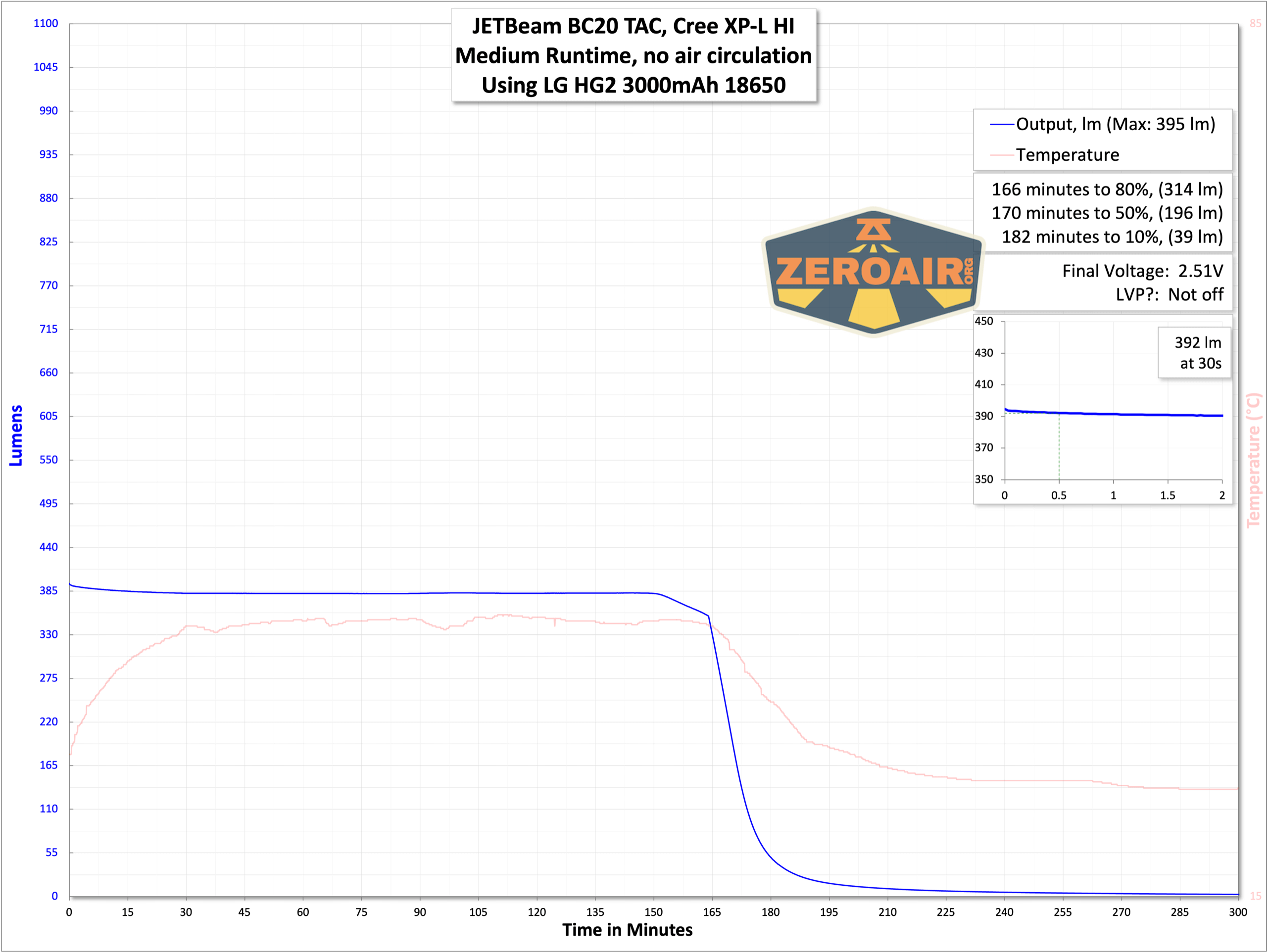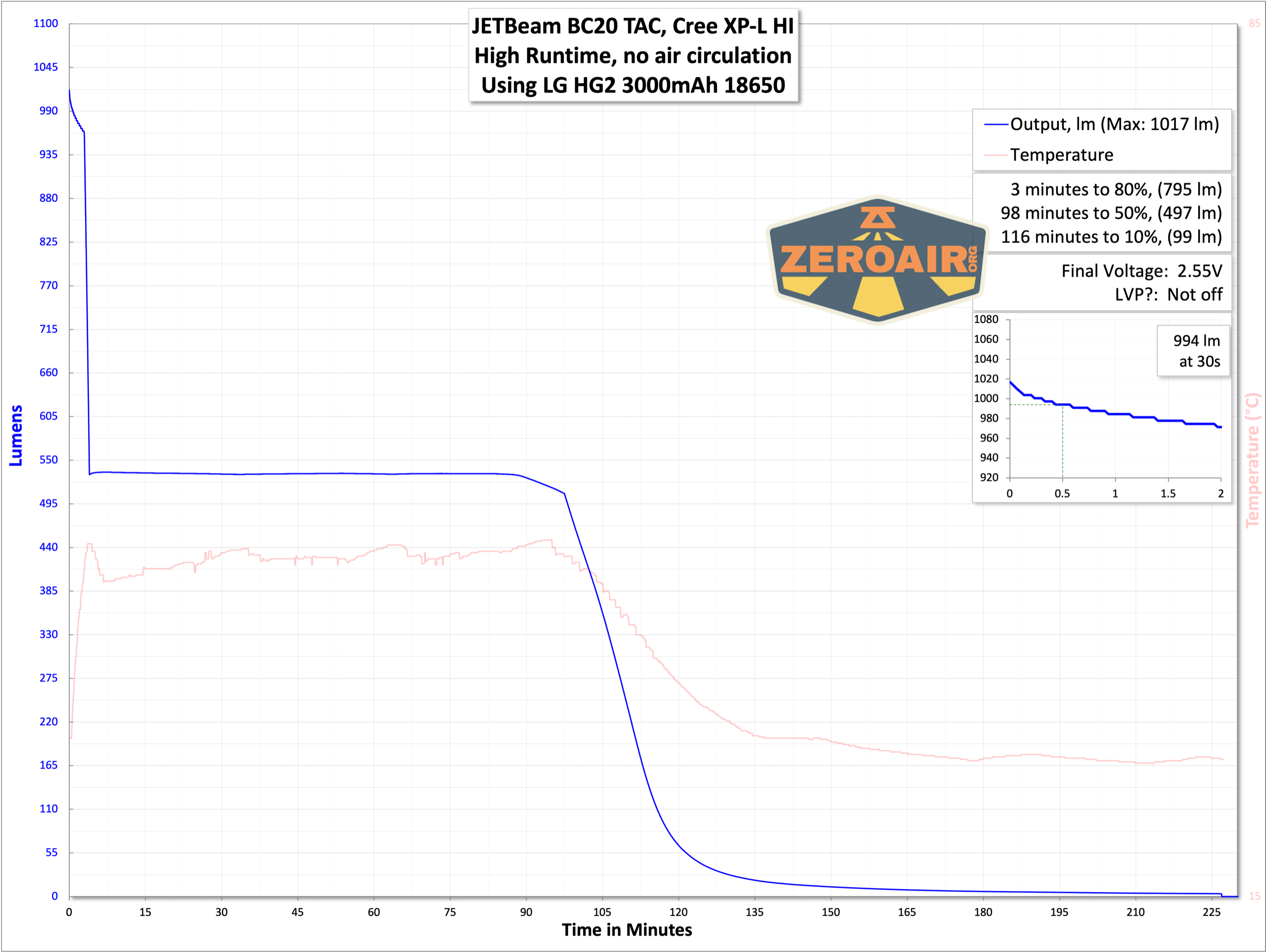 Below are a couple of runtime tests. Output is fairly good, but not quite hitting the claim of 1100 lumens. However, and importantly, it’s close – it doesn’t seem like JETBeam is trying to game the numbers here.