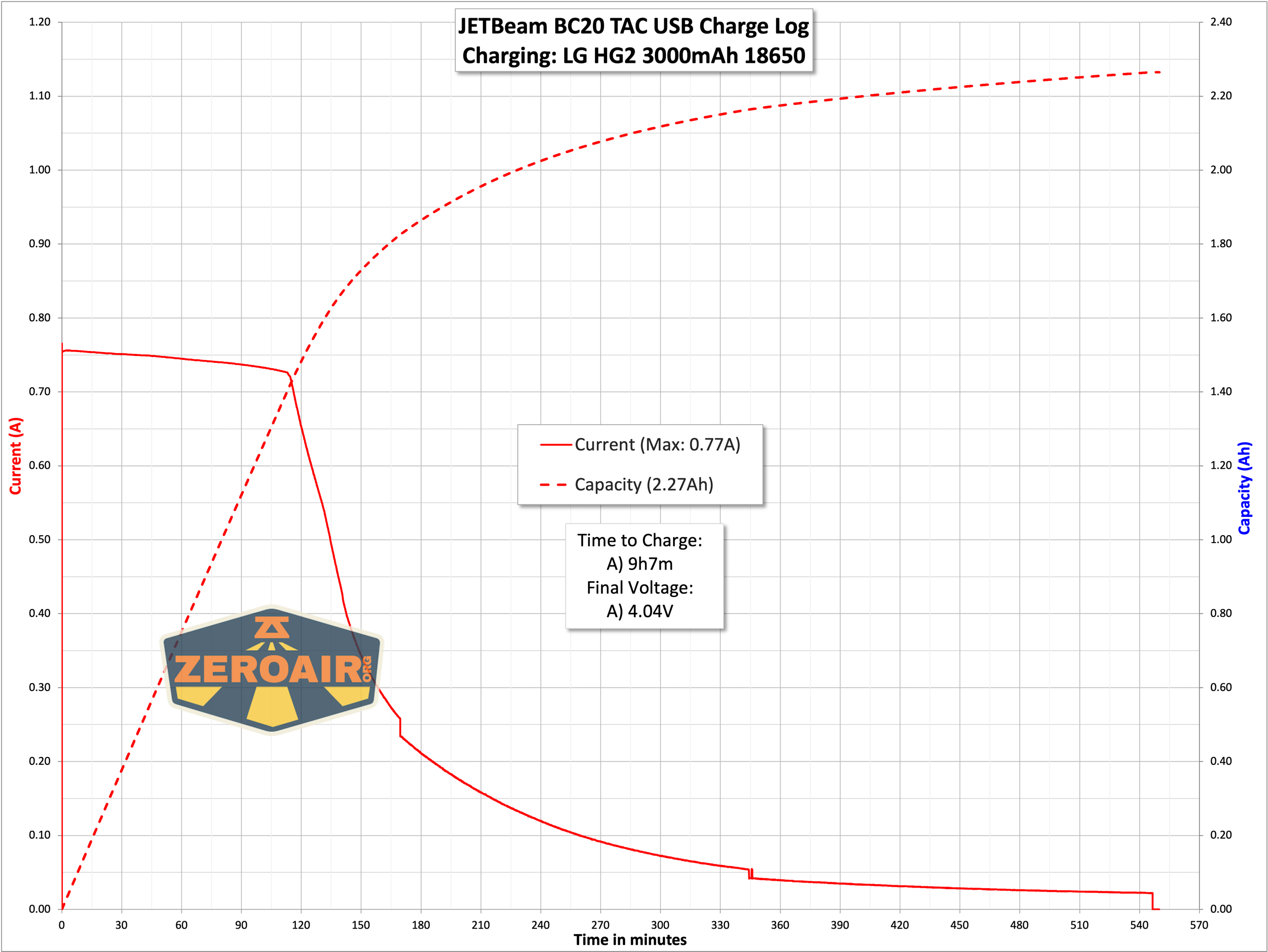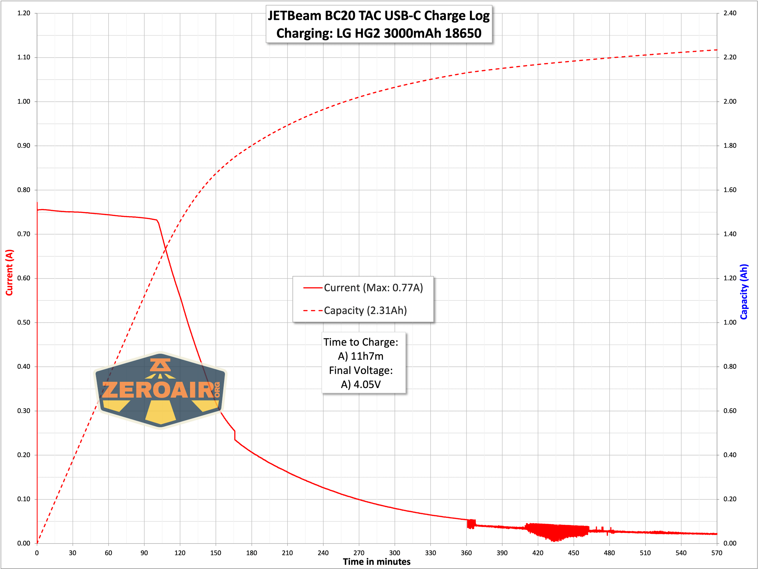 As I said above, JETBeam didn’t include a cell. That could explain the charge rate you see below – around 0.75A. JETBeam might be playing it safe, not knowing what cell you’ll use, and going with a reasonable charging rate for any 18650. I find that less likely than the charge rate just being slow – it takes a long time! The “Time to Charge” may be a bit skewed, too, since charging never really seems to properly stop…