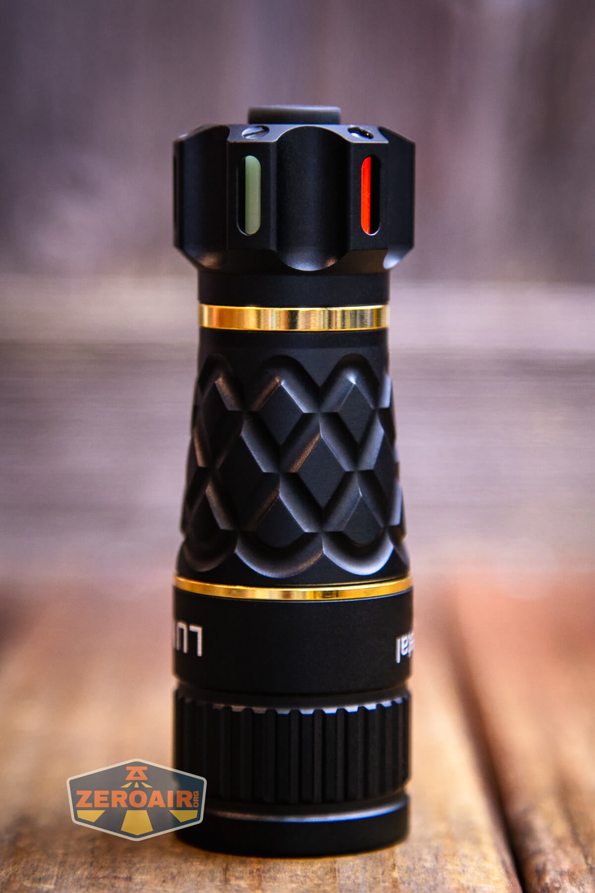 Those familiar with Lumintop will recognize this as a Lumintop right away. These gold bands have become very recognizable. The Lumintop Petal LEP and LED flashlight also has a bunch of other interesting features, like these glow tubes in the tailcap. Also, this light sports a “pineapple” body design.