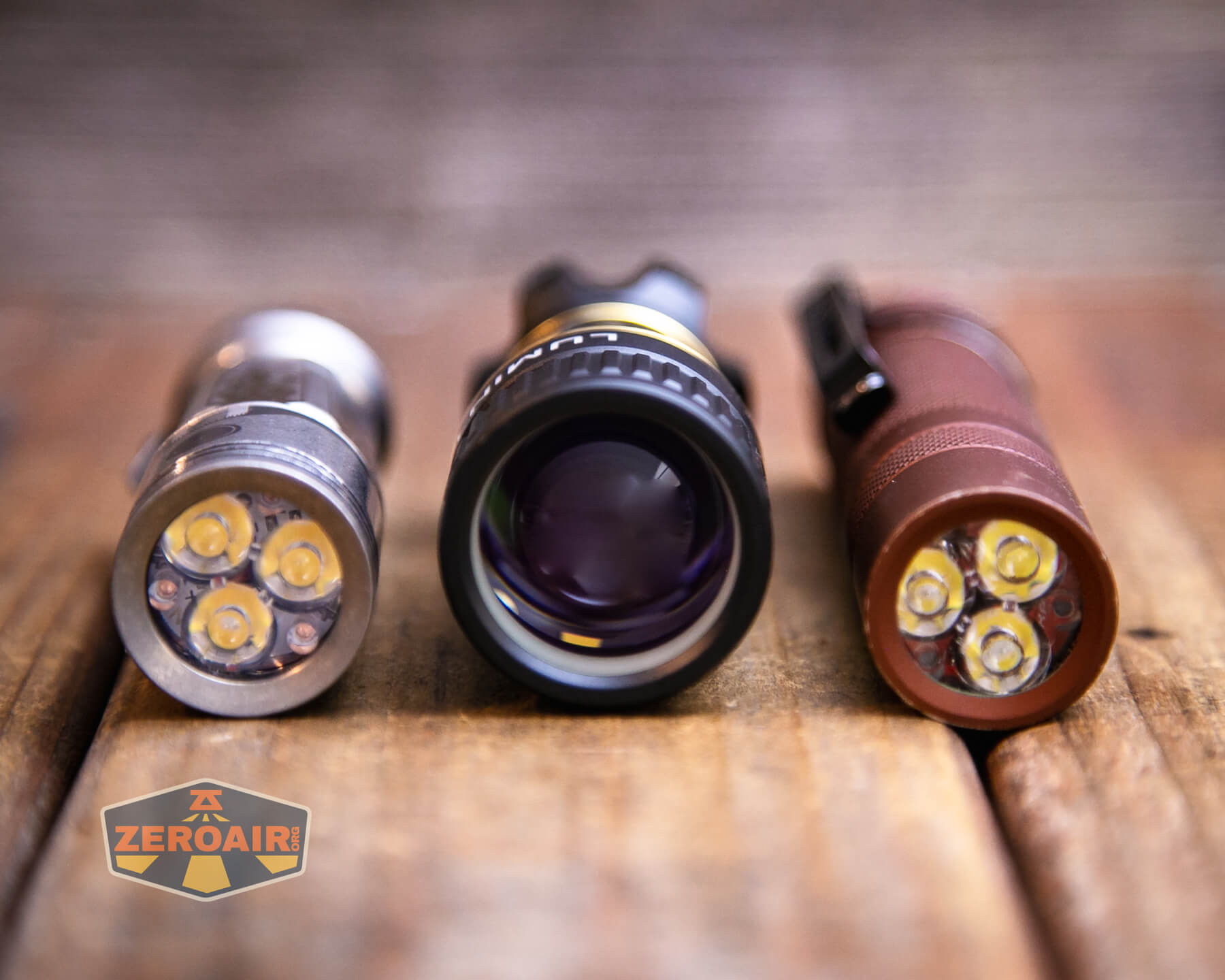 Also above on the left is a new feature light!! Laulima Metal Craft sent this titanium Todai for some size comparison photos like the ones above. Laulima has a bunch of incredible items. I’ve tested one (the Laulima Metal Craft Hoku) (the official site for Hoku is here) that was a Friend Fund Friday review. I was impressed enough by that Hoku that I bought a Laulima Metal Craft Diamond Slim (also in tumbled aluminum) (review is upcoming!) These lights by Laulima have impeccable build quality and not only that, they’re quite configurable. There are some (great, actually) default configurations, but Joshua Dawson (of Laulima Metal Craft) is open to ideas and emitter options and the like. I haven’t reviewed this Todai, but I have to say, it feels absolutely fantastic and I love it thus far. (Notably, I love how warm and eggy those emitters look through the TIR.)