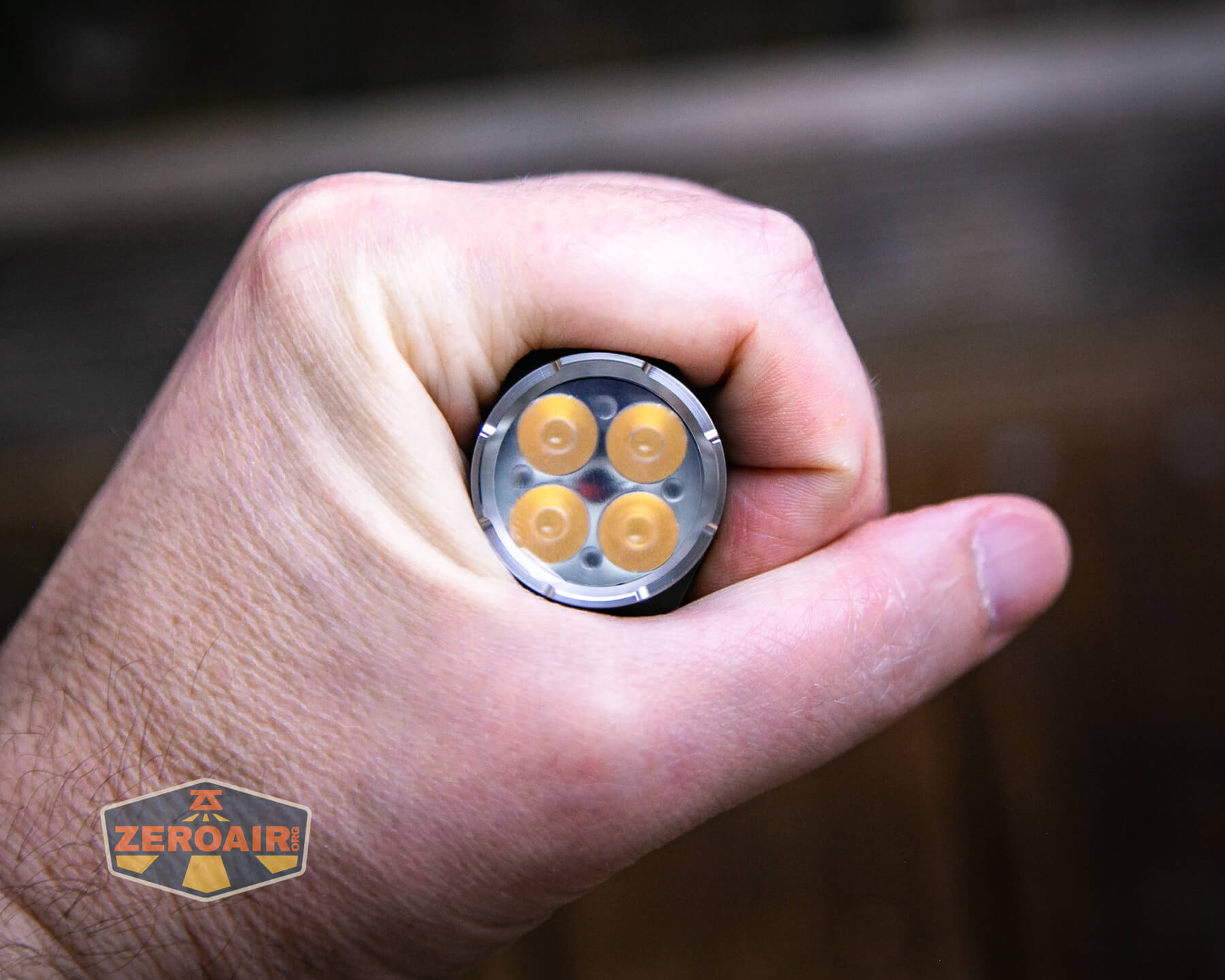 The threads on this quad are very smooth. They’re square-cut and fairly fine, long, and anodized. You might want to lightly unscrew the tailcap like I do, to mechanically lock out the light.