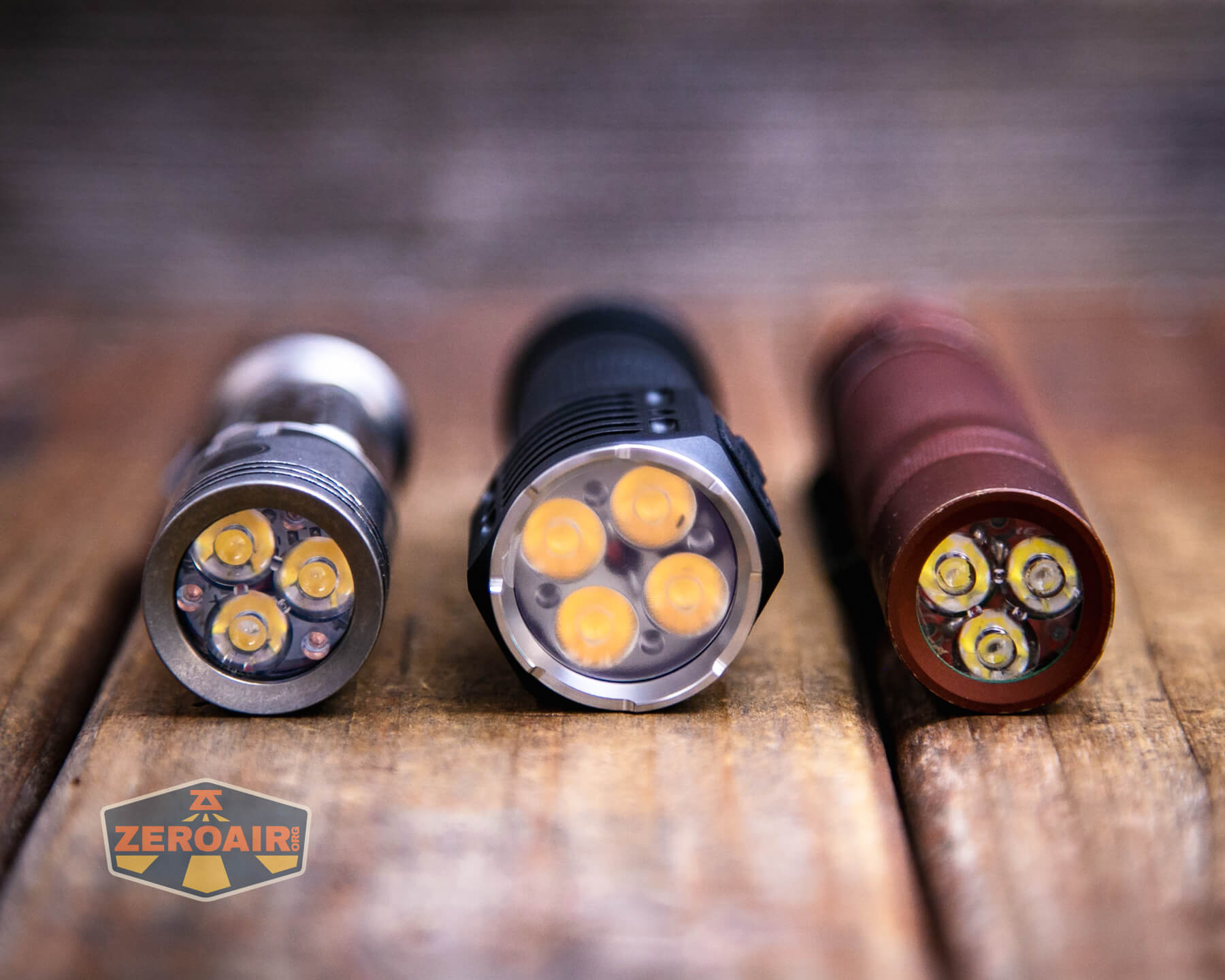 Also above on the left is a new feature light!! Laulima Metal Craft sent this titanium Todai for some size comparison photos like the ones above. Laulima has a bunch of incredible items. I’ve tested one (the Laulima Metal Craft Hoku) (the official site for Hoku is here) that was a Friend Fund Friday review. I was impressed enough by that Hoku that I bought a Laulima Metal Craft Diamond Slim (also in tumbled aluminum) (review is upcoming!) These lights by Laulima have impeccable build quality and not only that, they’re quite configurable. There are some (great, actually) default configurations, but Joshua Dawson (of Laulima Metal Craft) is open to ideas and emitter options and the like. I haven’t reviewed this Todai, but I have to say, it feels absolutely fantastic and I love it thus far. (Notably, I love how warm and eggy those emitters look through the TIR.)