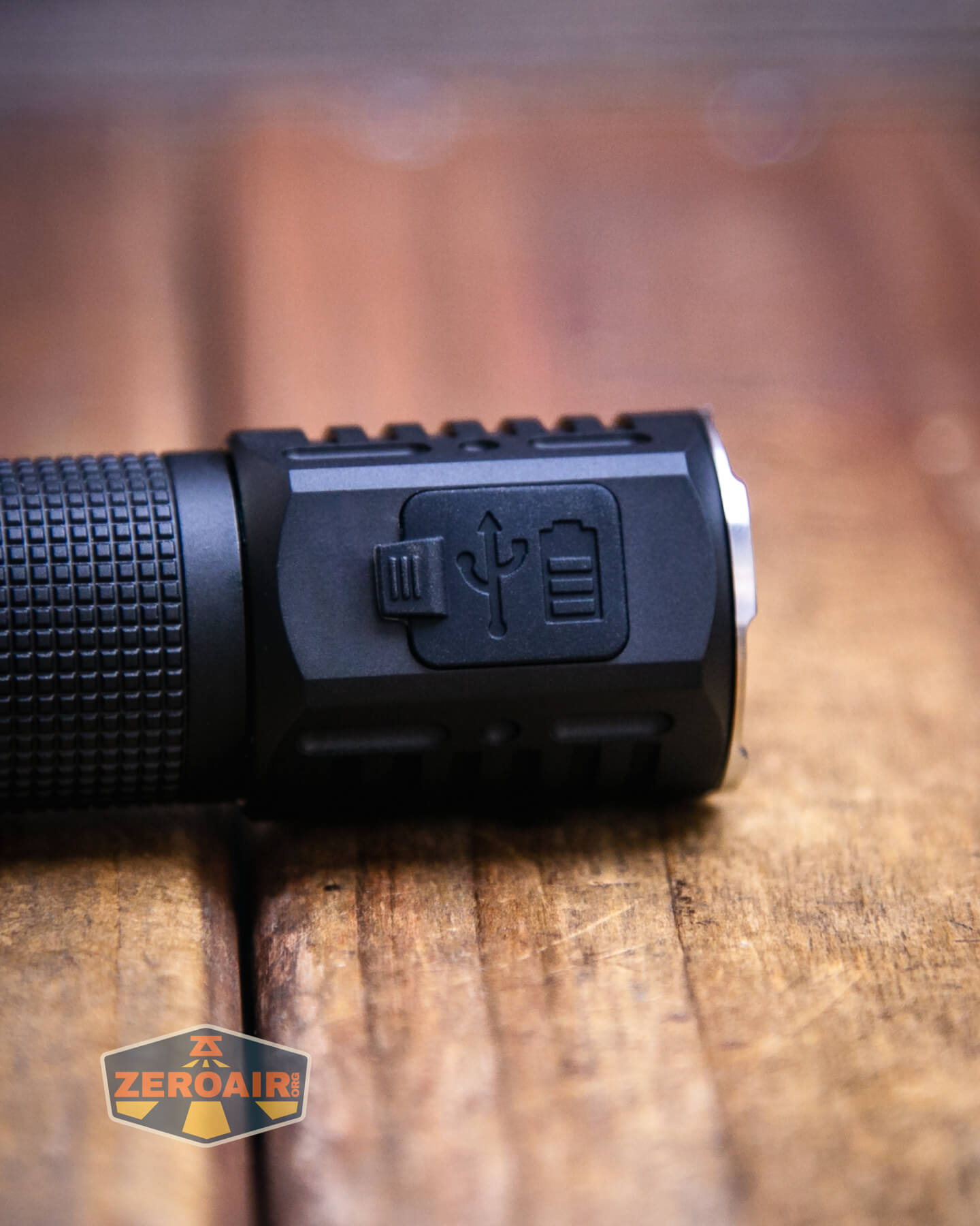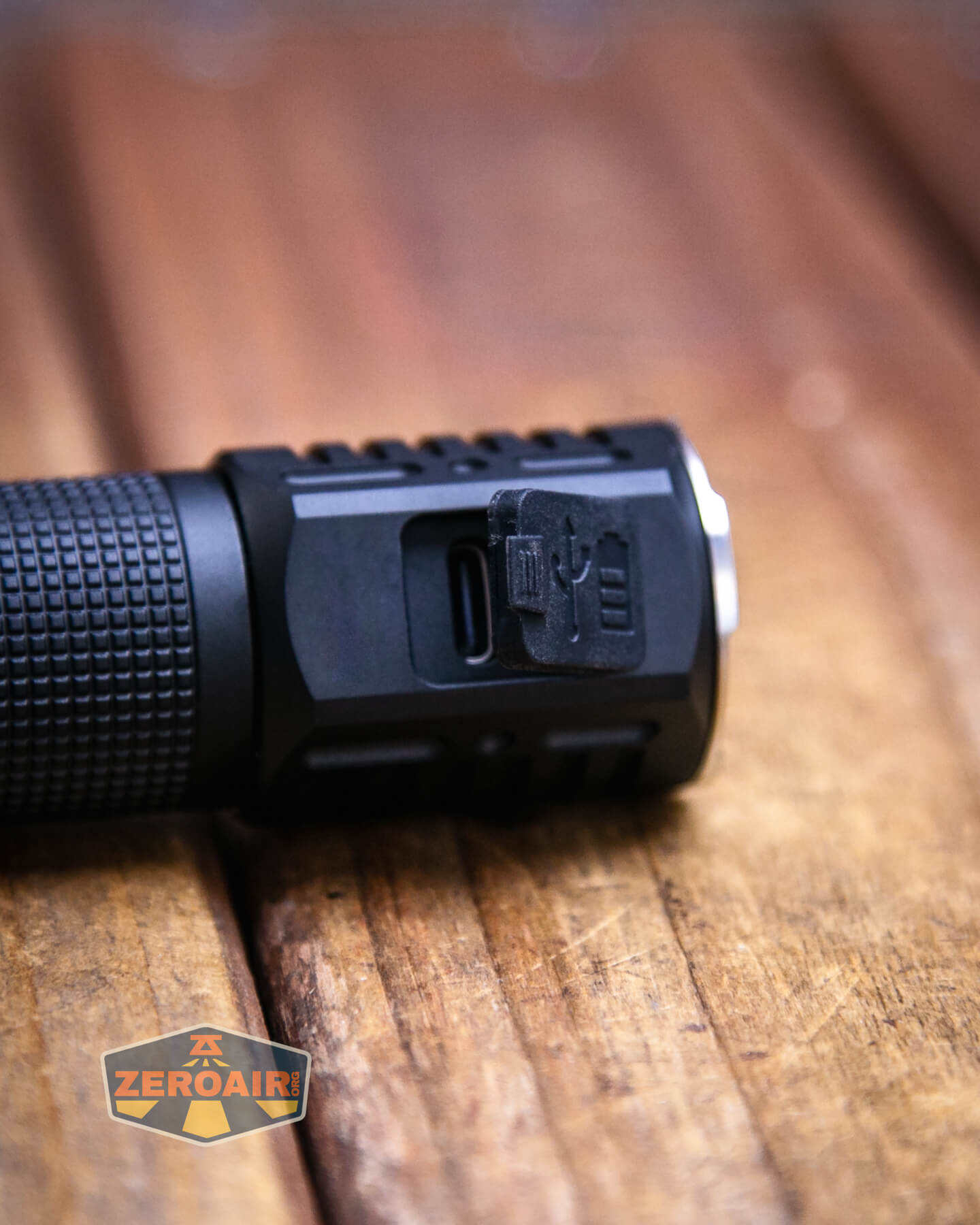 Charging on the Lumintop Apollo flashlight comes by way of a USB-C charging port in the head. The charge port has a press-in cover, which seems secure.