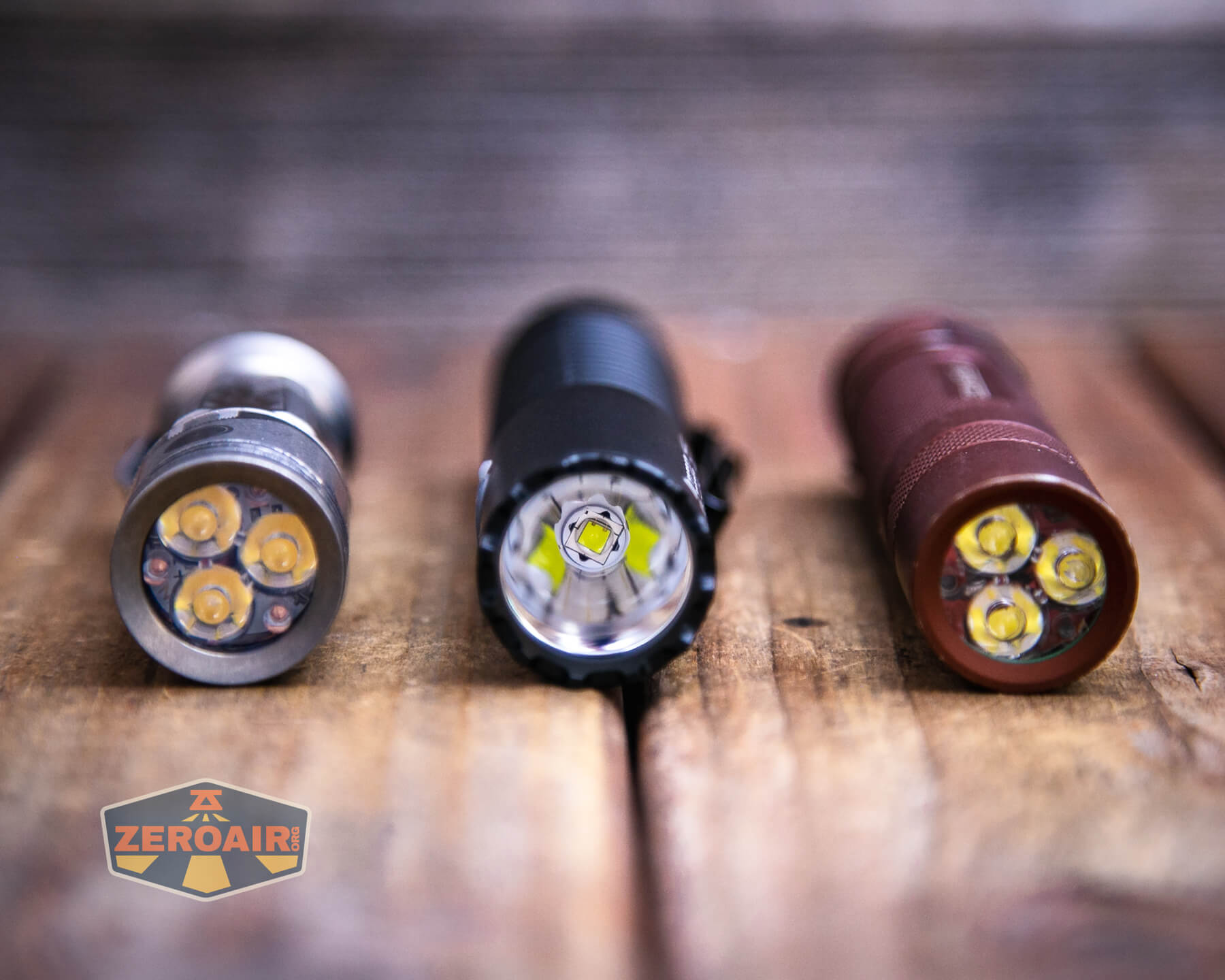 Also above on the left is a new feature light!! Laulima Metal Craft sent this titanium Todai for some size comparison photos like the ones above. Laulima has a bunch of incredible items. I’ve tested one (the Laulima Metal Craft Hoku) (the official site for Hoku is here) that was a Friend Fund Friday review. I was impressed enough by that Hoku that I bought a Laulima Metal Craft Diamond Slim (also in tumbled aluminum) (review is upcoming!) These lights by Laulima have impeccable build quality and not only that, they’re quite configurable. There are some (great, actually) default configurations, but Joshua Dawson (of Laulima Metal Craft) is open to ideas and emitter options and the like. I haven’t reviewed this Todai, but I have to say, it feels absolutely fantastic and I love it thus far. (Notably, I love how warm and eggy those emitters look through the TIR.)