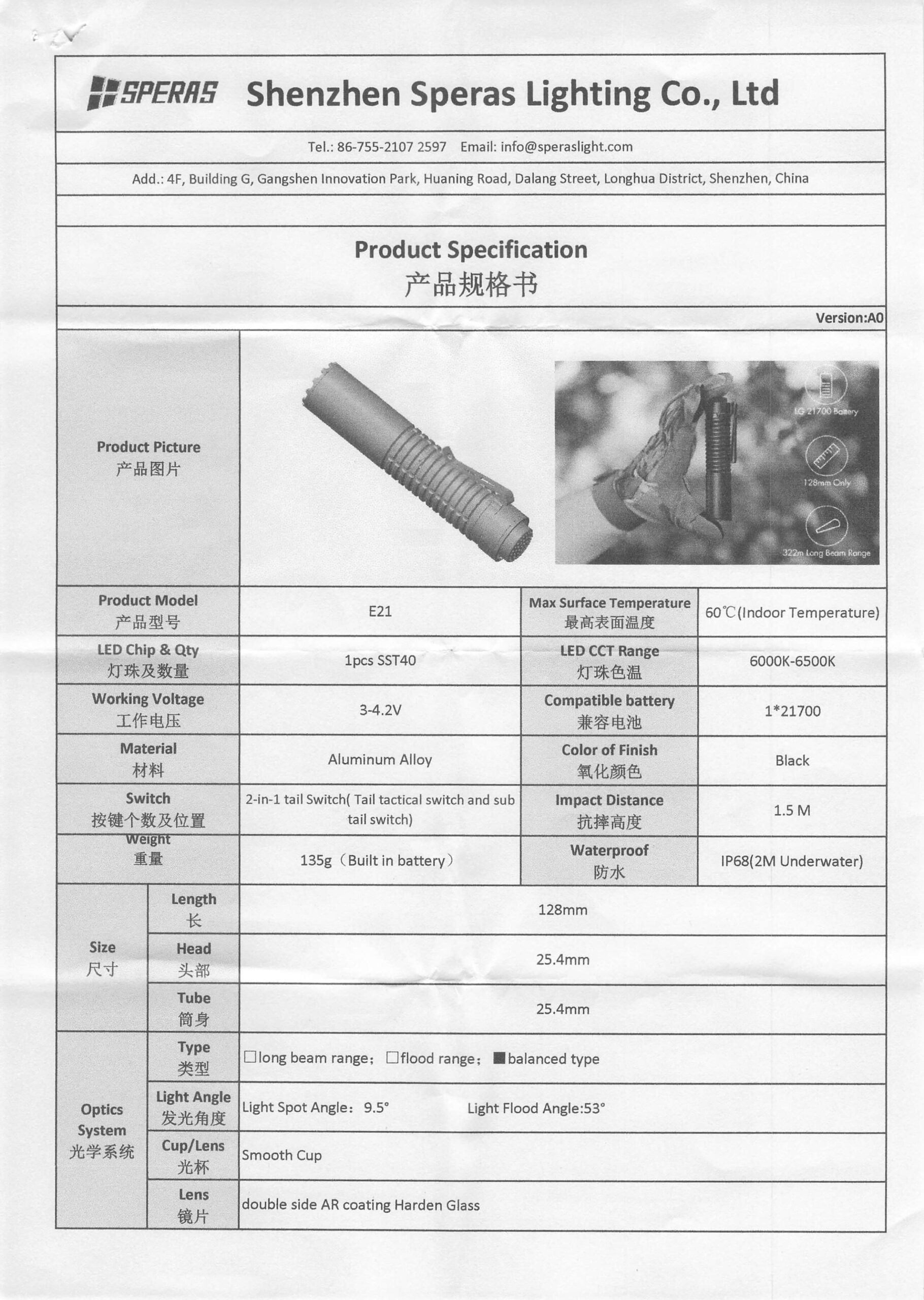 The Speras E21 flashlight is a 21700 cell flashlight running a single Luminus SST-40 emitter. The tactical E21 has a neat dual-action switch. Read on!