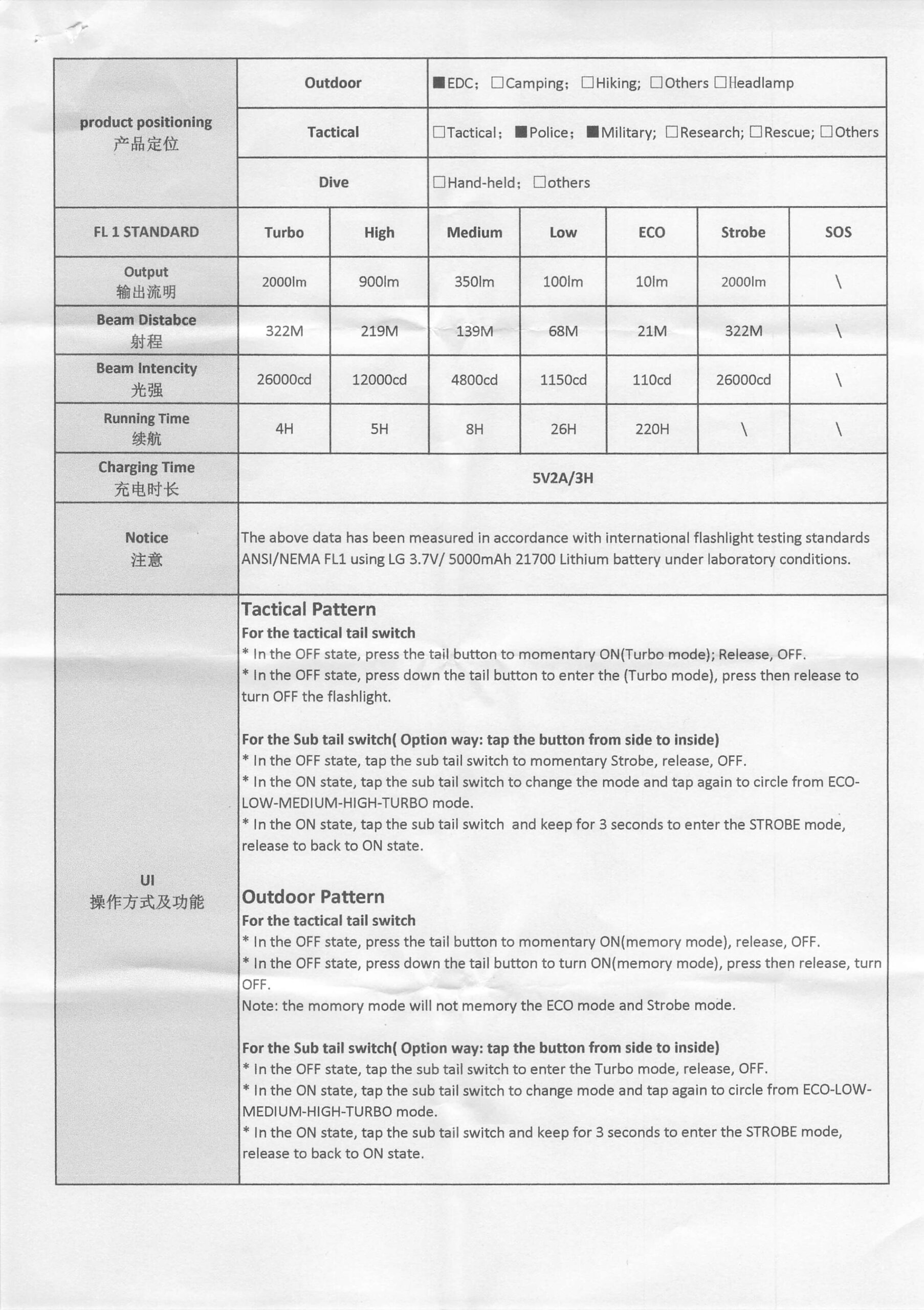 | Mode | Mode Claimed Output (lm) | Claimed Runtime | Measured Lumens |