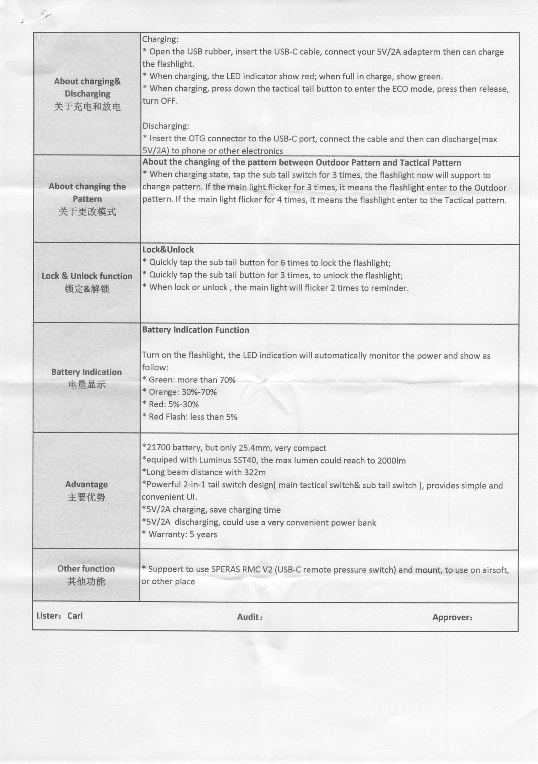 | Charging | Tap Sub tail 3x | Changes pattern (Outdoor or Tactical) with blinks to indicate (Tactical: 4 blinks. Outdoor: 3 blinks) |