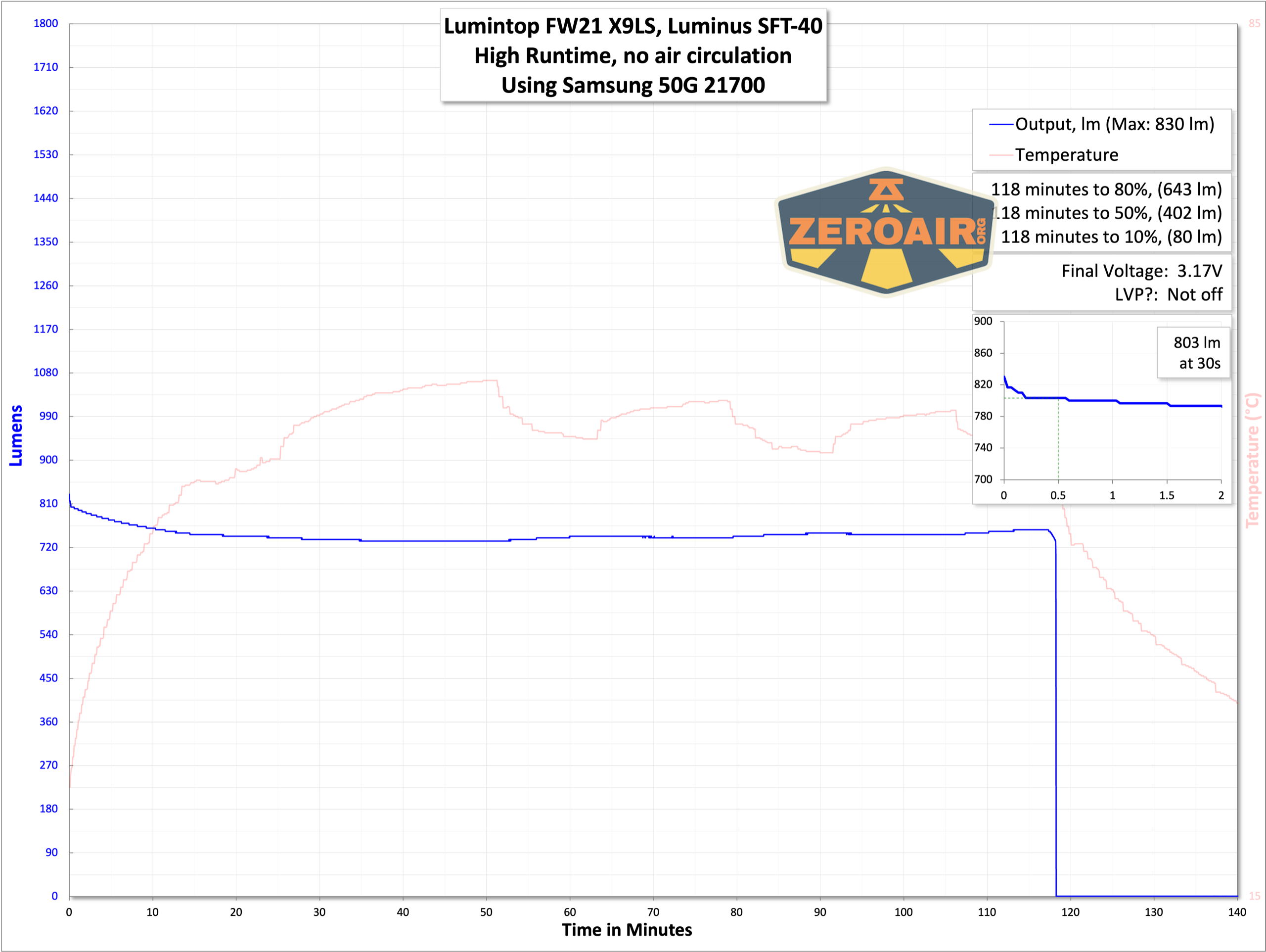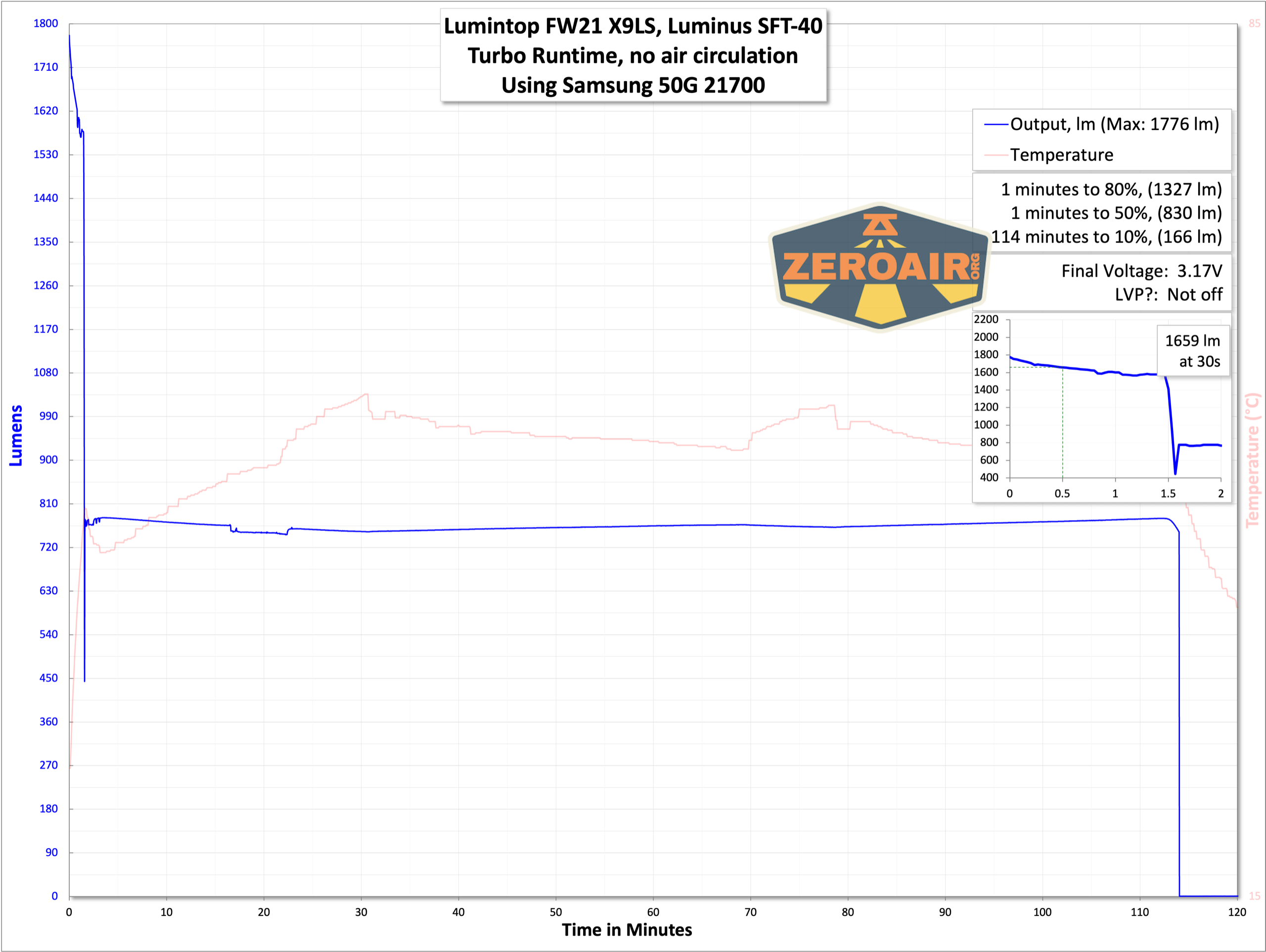 Below you can see a couple of runtime tests. I tested the two discrete highest modes – Turbo and High. Below that, there are no specific modes, but ramping through the output range is possible.