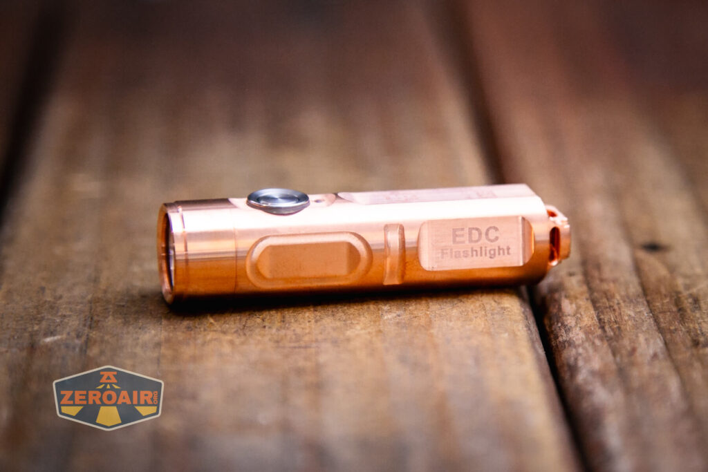 There’s a single side switch for operating the RovyVon Aurora A9 Pro copper flashlight. It’s a clicky e-switch.