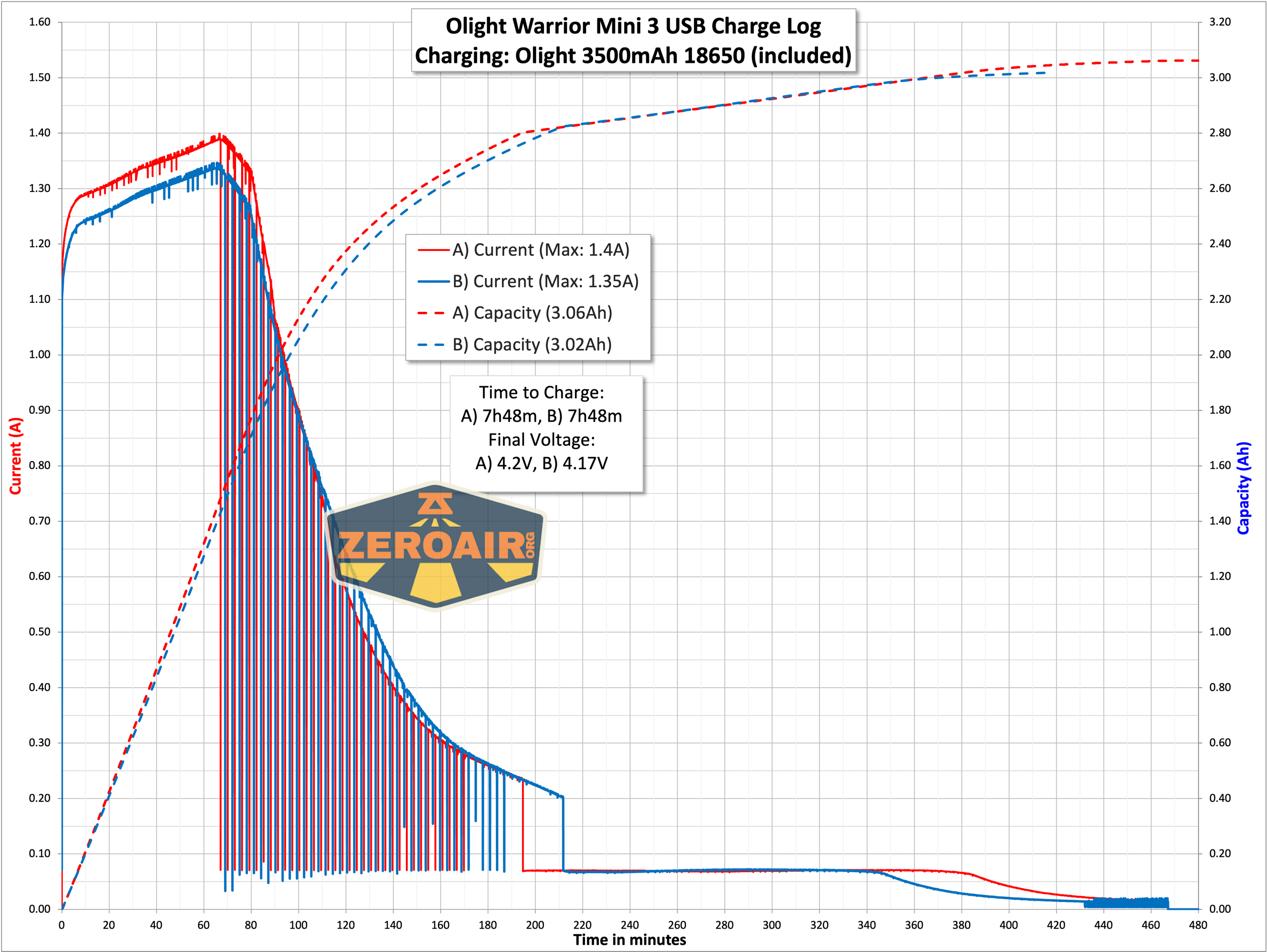 The indicating e-switch does not give any charging information, but the charging bases all have a red/green indicator. Red means charging and green means charging is complete. The base turns green long before charging stops, but I’d guess it’s turning green right around the 200-220 minute mark in the graph above. The cell is essentially fully charged at this point.