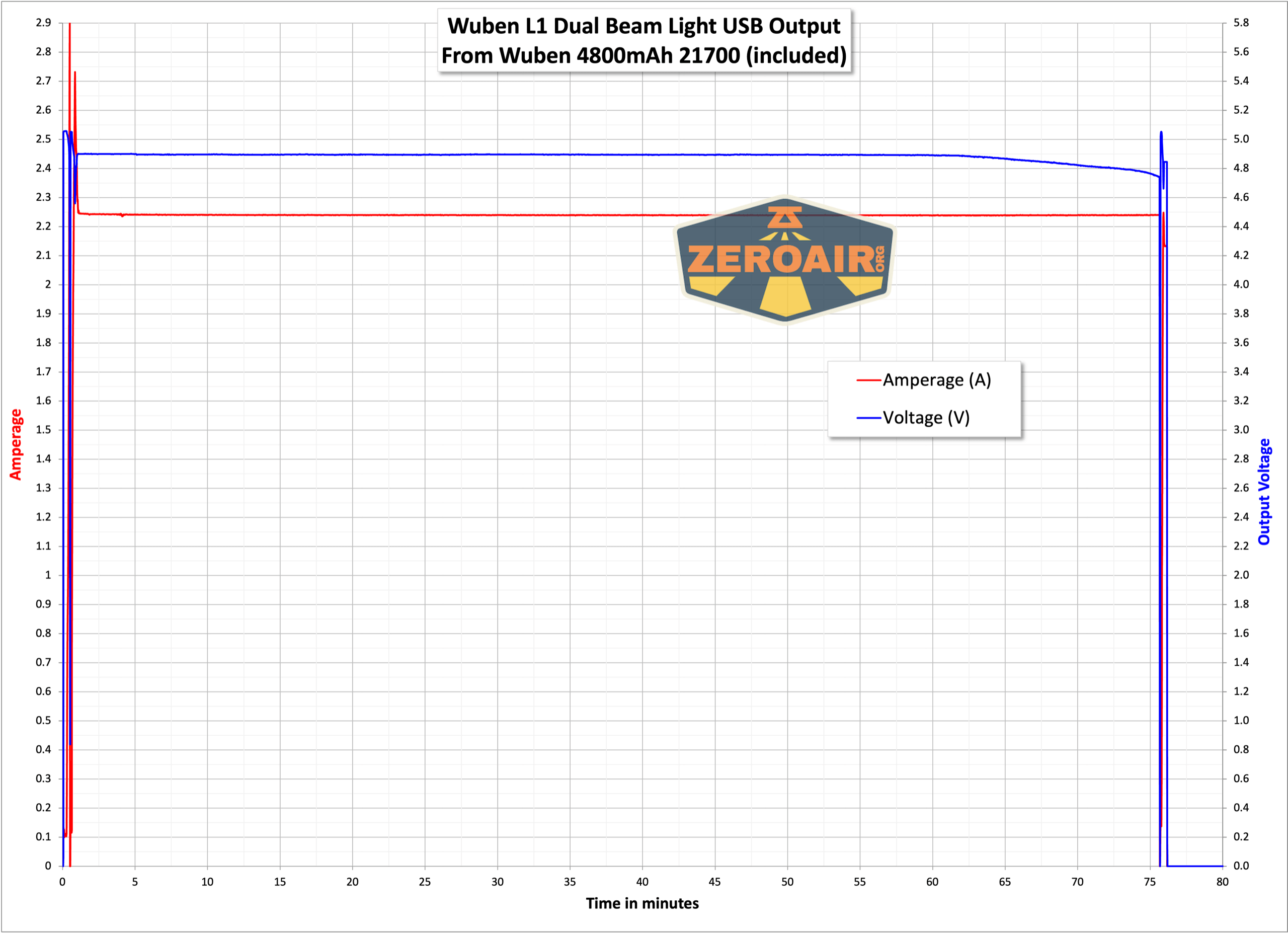 Here’s a complete cycle of ouptut – well over two hours at over 2A. A cell voltage of around 3V will not run the powerbank, so the light does have protection in that regard.