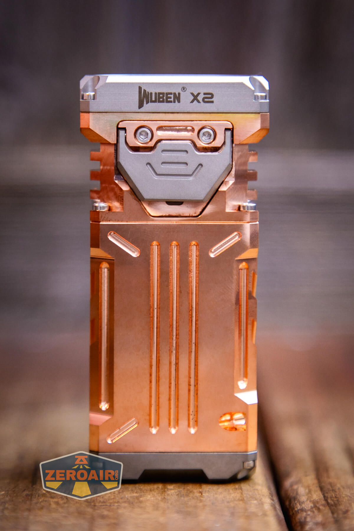 The Wuben X-2 Copper flashlight has an interesting design. We’ve seen rectangular lights before, but they’re still uncommon enough to warrant discussion. This light has mostly the same look as the X-1 Falcon but with some design mixed in from the X-0 Knight. All in all, it’s a great mix-up of the two lights.