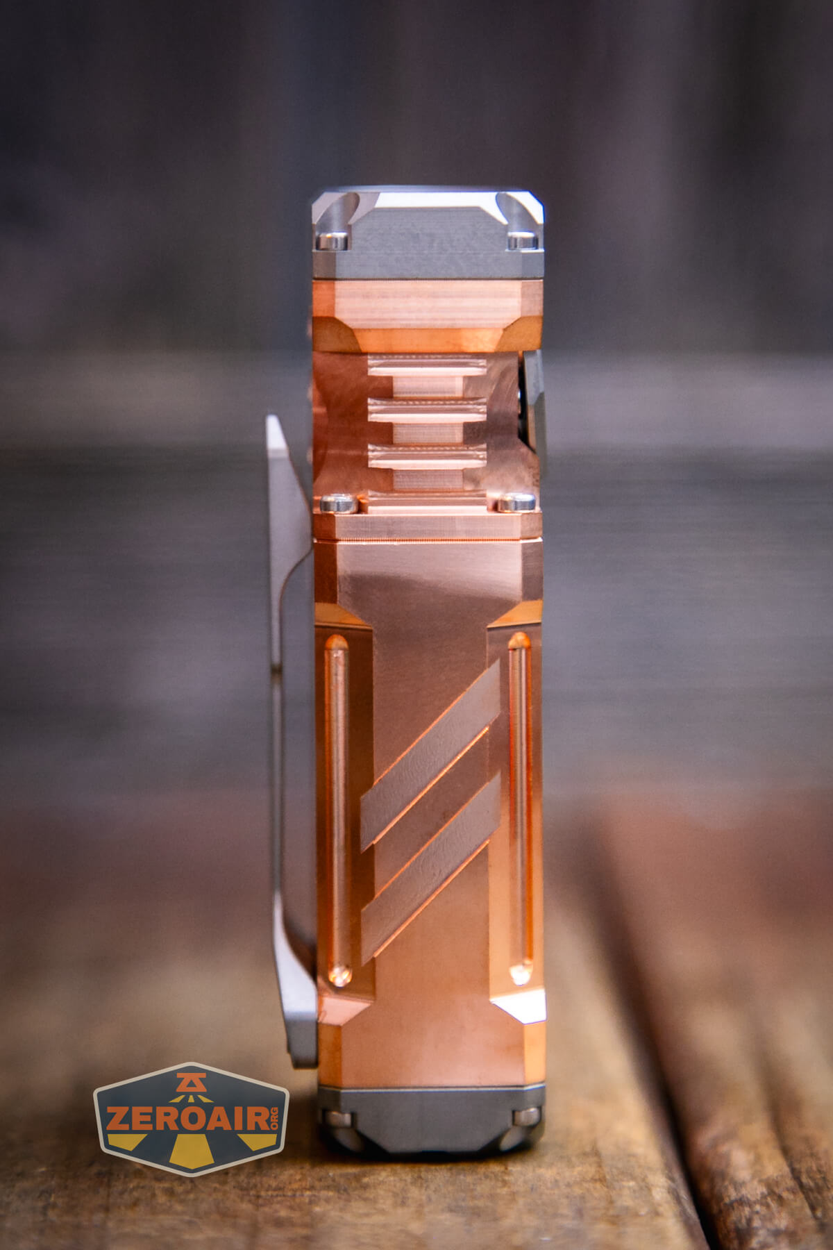 I gotta tell you… the edges on this light are basically unfinished. Or “unrounded” or whatever word you might use that helps convey that these edges (particularly on those three grooves that run up the center) are sharp. I wouldn’t say they’re sharp in the way where you might end up with a cut but… They’re sharp. I didn’t compare but don’t recall any other version being this way, so I have to surmise that it’s intentional. It’ll wear down with usage, I’m sure but just on first blush this is not my favorite feature of the Wuben X-2 Copper flashlight.