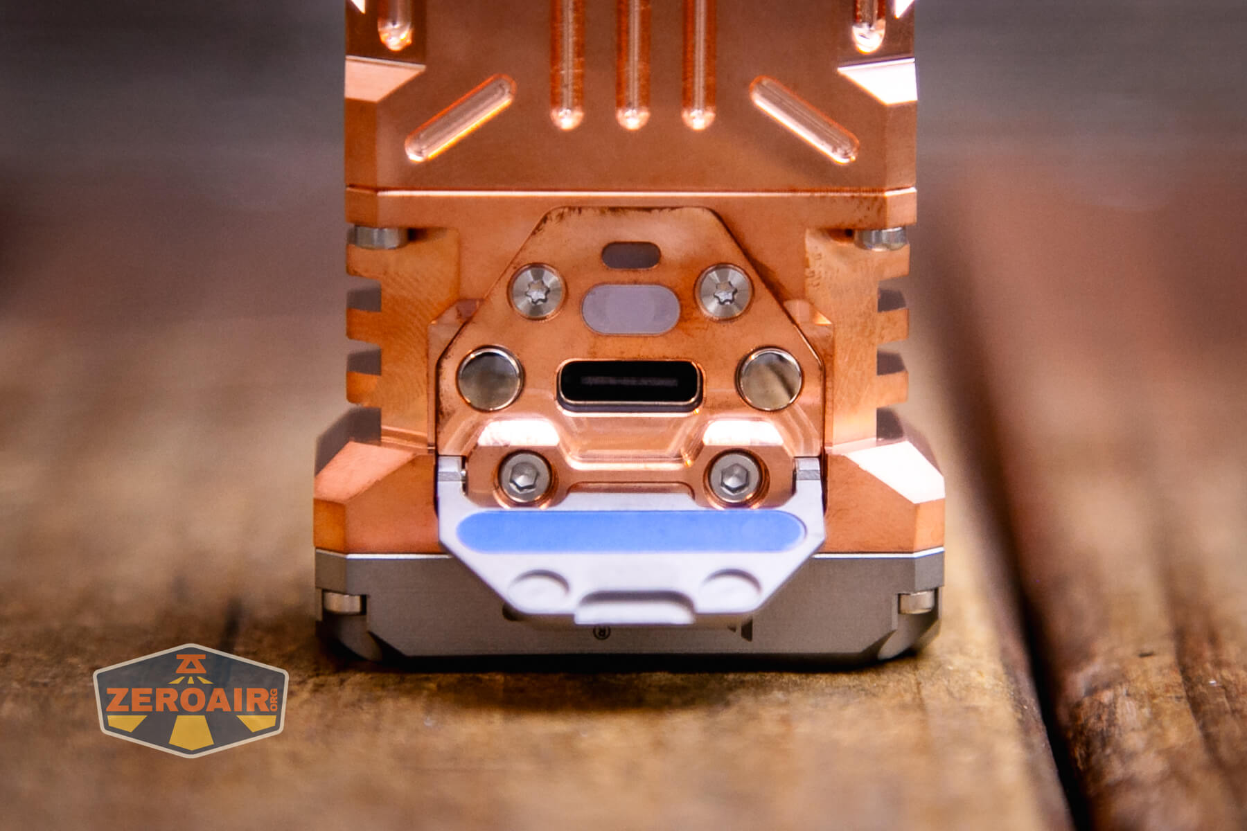 Charging on the Wuben X-2 Copper flashlight is by way of a USB-C charging port on the head. This charging port has an interesting flap cover much like the switch that was seen on the Wuben X-0. This cover also serves to actuate the e-switch.