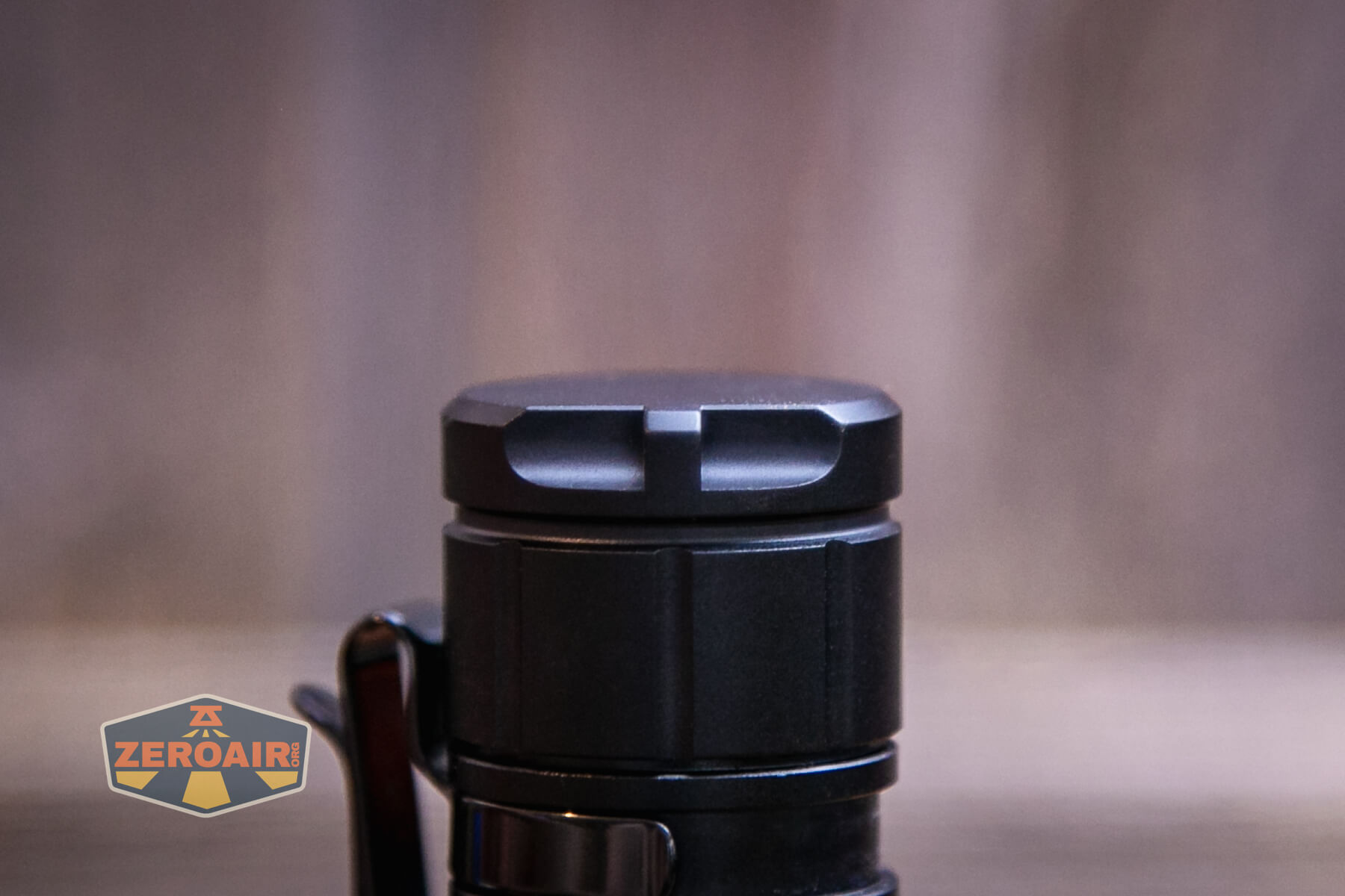 Included (and installed) is a two-way deep carry friction-fit pocket clip. The clip is not reversible and can only go on the tail, but again, it’s a two-way clip. Bezel down the light sticks up a bit over the pocket. Bezel up, there’s around 2″ out of the pocket. (To wit, there’s no good reason to bother with a two-way clip here, since so much will stick out of the pocket in a bezel-up carry.)