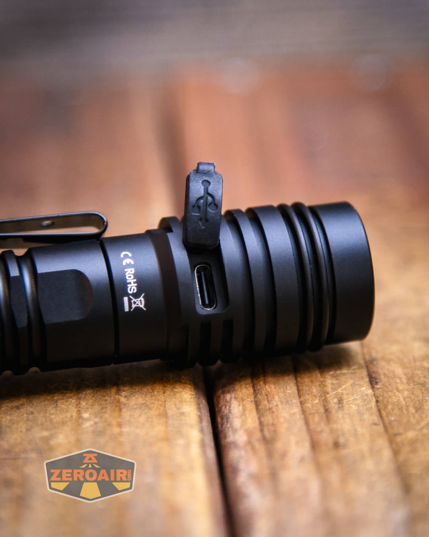 Another feature of the Wurkkos FC13s flashlight is built-in charging. There’s a USB-C port in the head, which has a press-in cover. This cover is quite thick, and when installed properly, very secure. It has a thick edge and must be pushed deliberately into the opening.