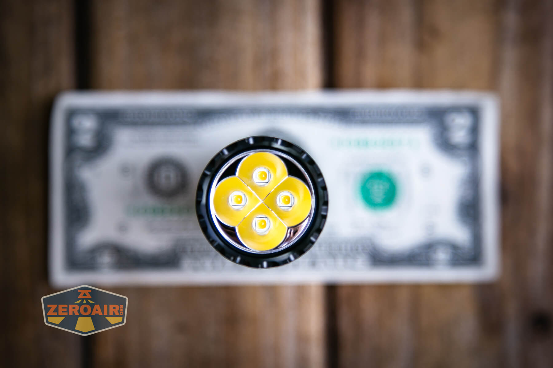 The emitters used by Acebeam in this light are four Nichia 519a in 5000K with 90 CRI. This is a great combination. They each have a small reflector, too.
