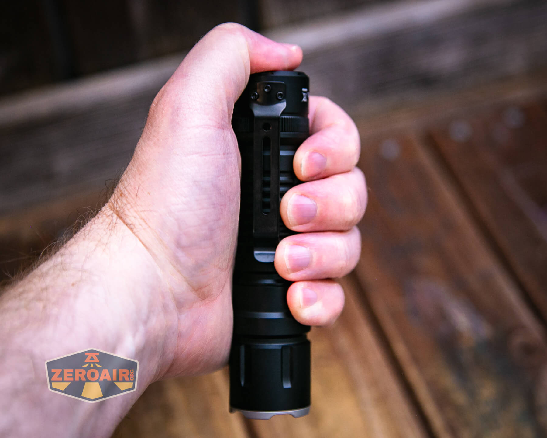 A single tail e-switch controls the Sofirn SC33 EDC flashlight. The switch has a nice metal (or hard plastic) cover. It’s very pleasant to use!
