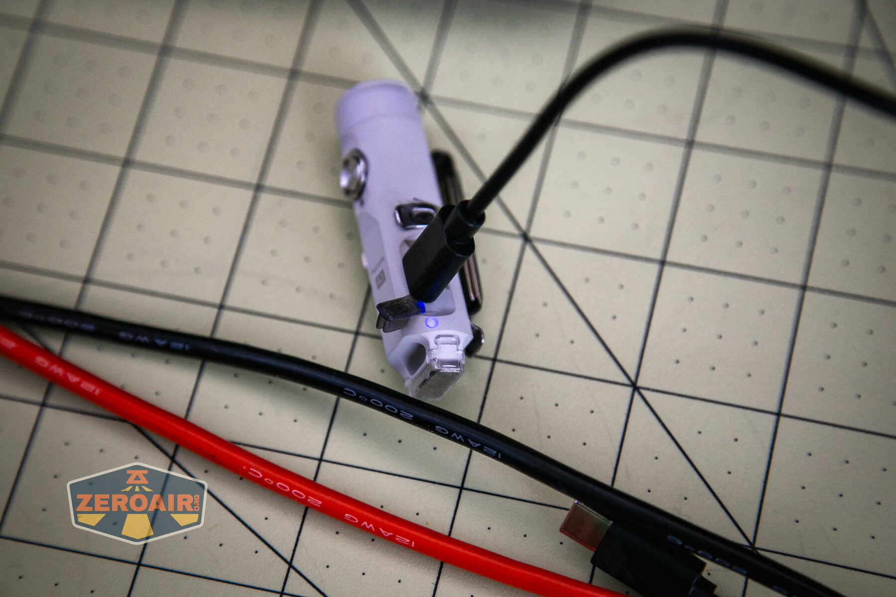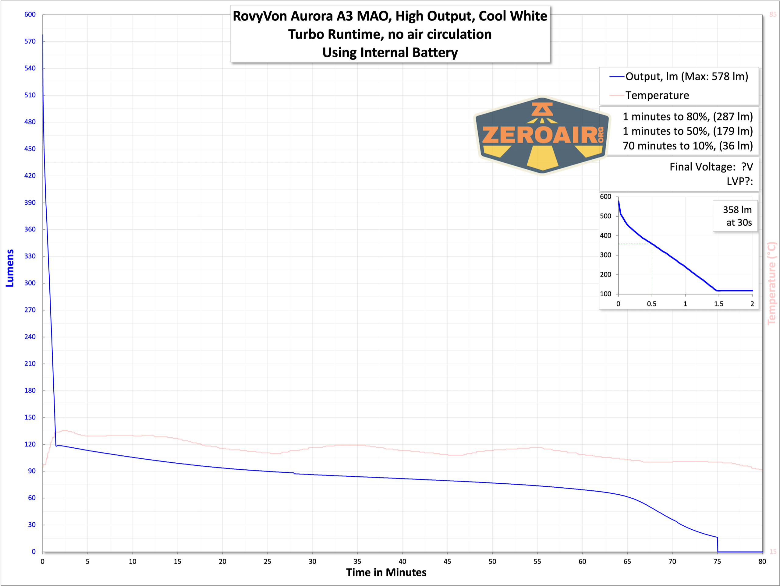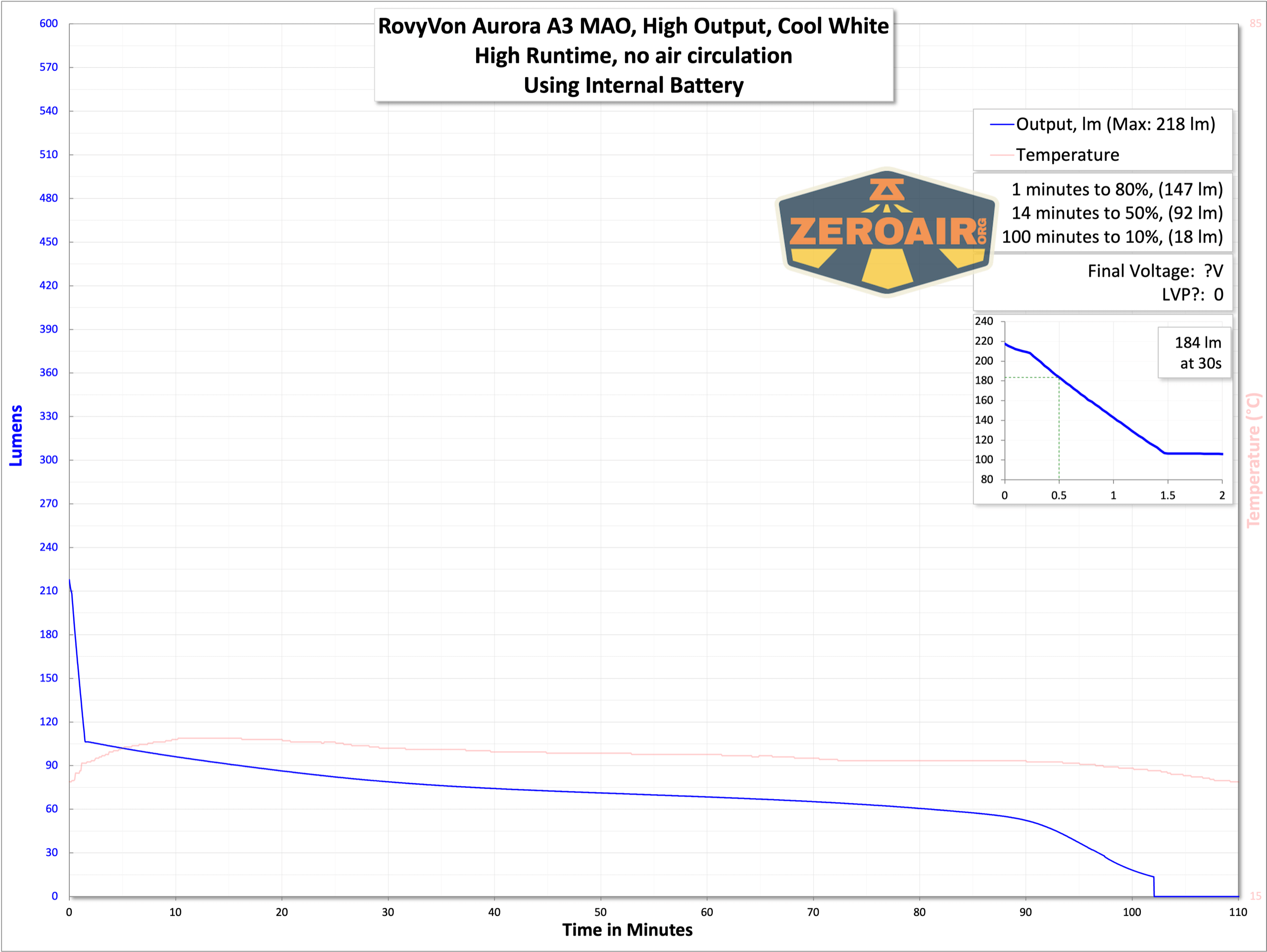 The light shuts off when the cell voltage is low, but I’m not able to test at what voltage it shuts off. RovyVon has confirmed that the shutoff voltage is 2.8V.