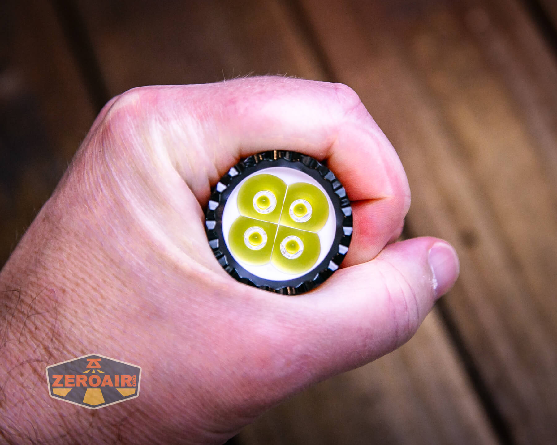 Olight doesn’t make an emitter claim here, but upon inspection, they appear to unsurprisingly be Osram P9. That fits well with Olight, so it seems like a safe call. There are four emitters, and this is generally the same setup as the previous Seeker 3 Pro. Note that we lost the proximity sensor. I consider that a huge win because generally, I wouldn’t say I like proximity sensors. I think the tradeoff is that the light locks out after 10 seconds of being off…