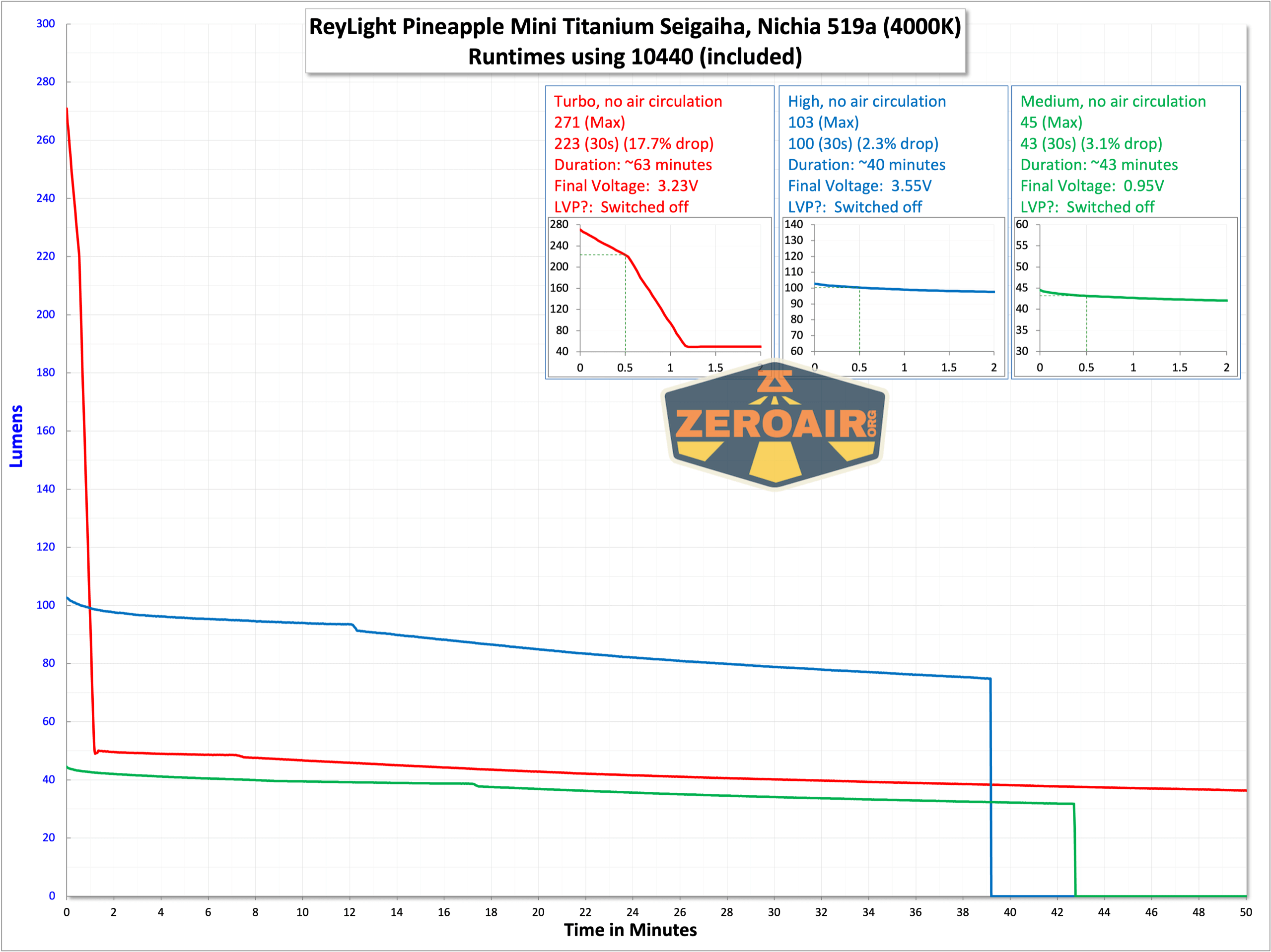 The ReyLight Pineapple Mini Seigaiha flashlight in titanium surprisingly can run on 1.5V sources, and also 4.2V sources. All the usual AAA types work – alkaline, NiMH, lithium primary. And also the lithium-ion 10440 cell works! Output is different between the voltages, too.