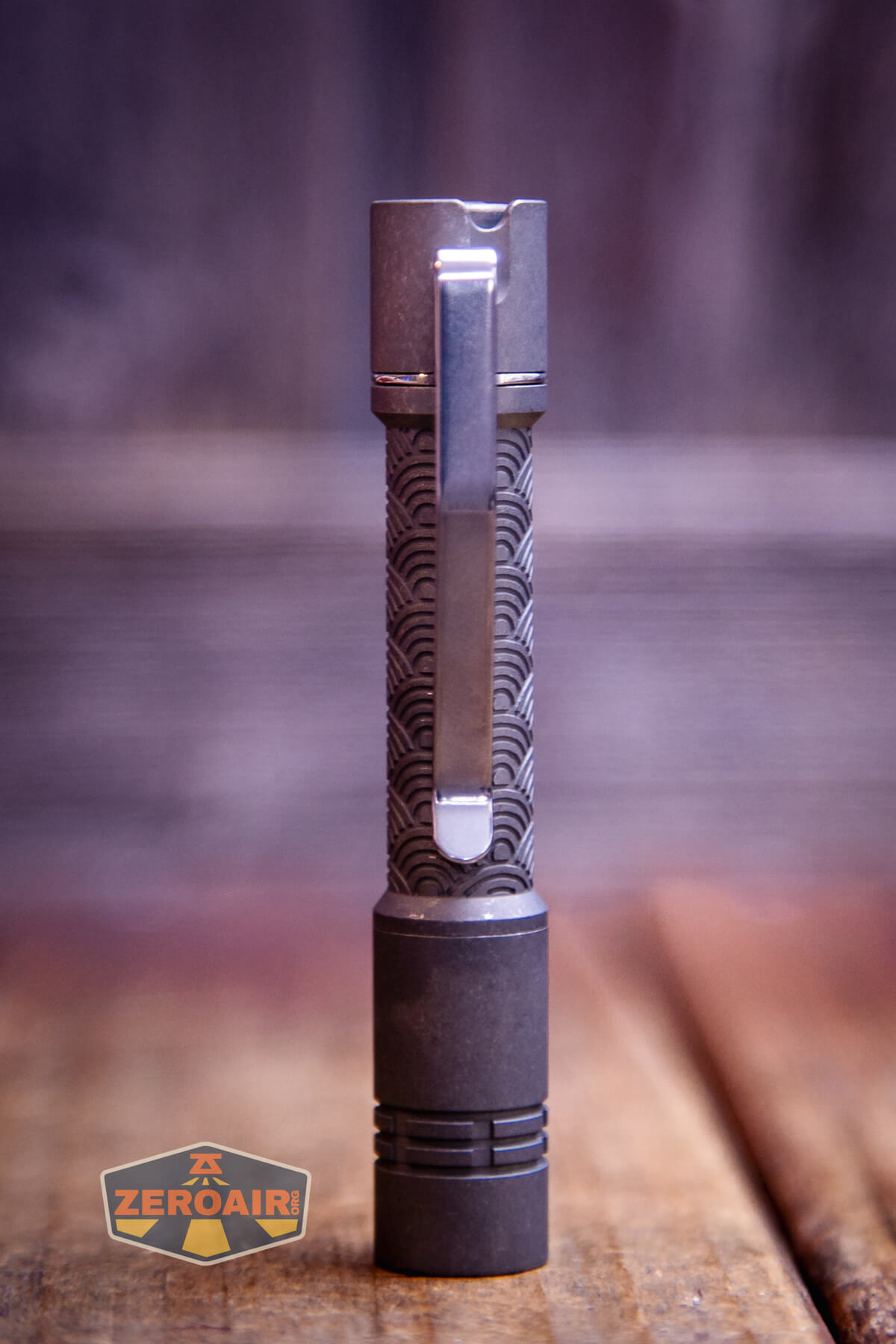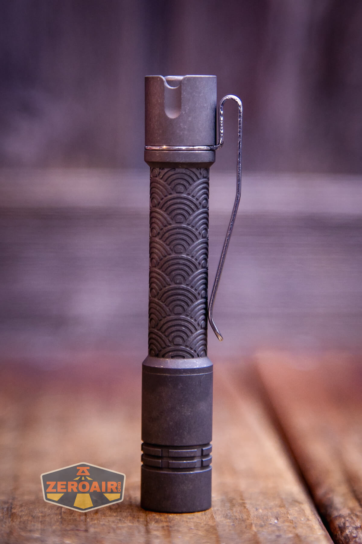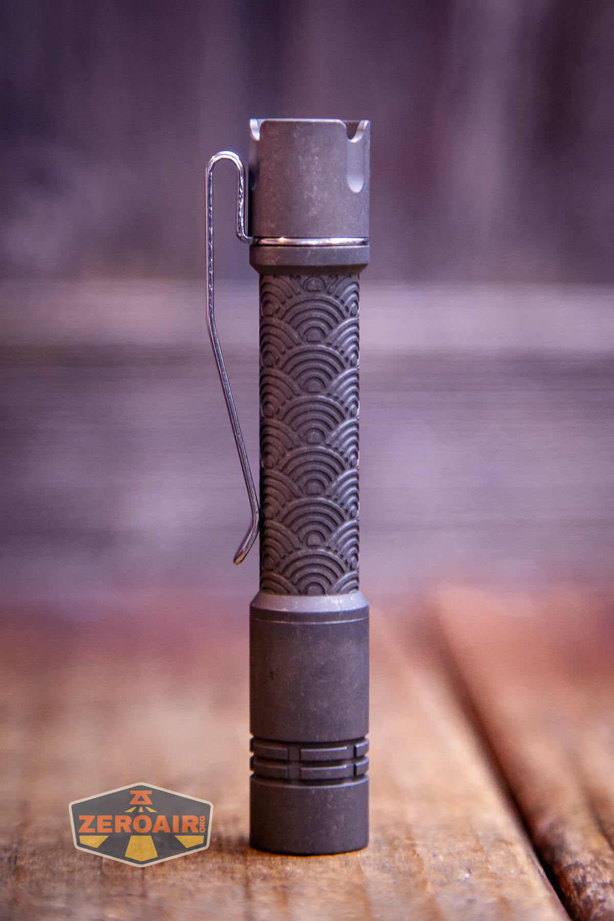 Two versions of the ReyLight Pineapple Mini Seigaiha flashlight in titanium exist. There’s this stonewashed version, as well as a bead-blasted version.