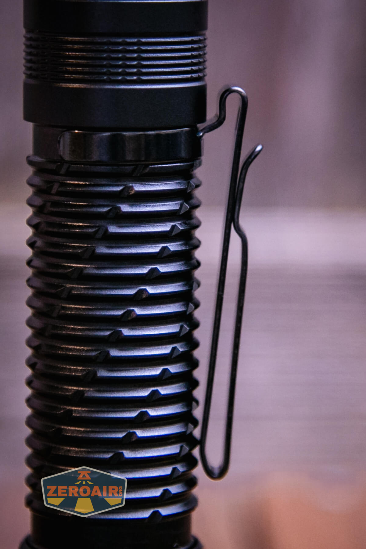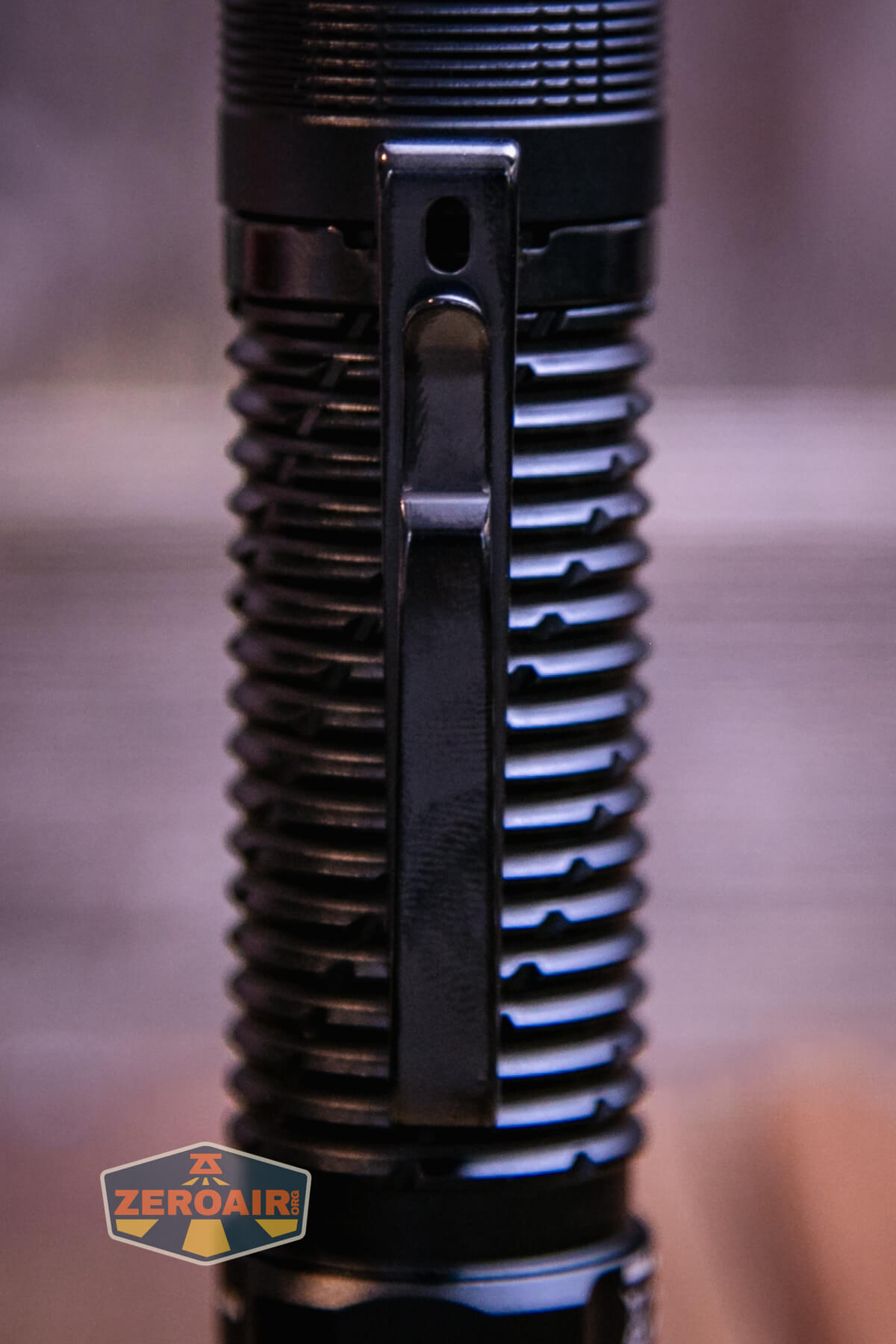 A pocket clip is included with the Nitecore MH12 Pro flashlight but it’s not attached.