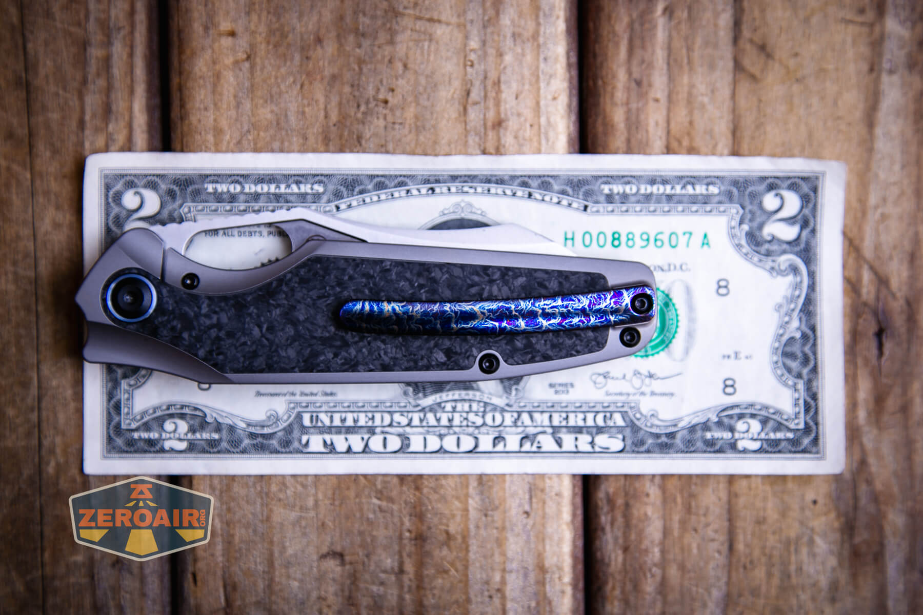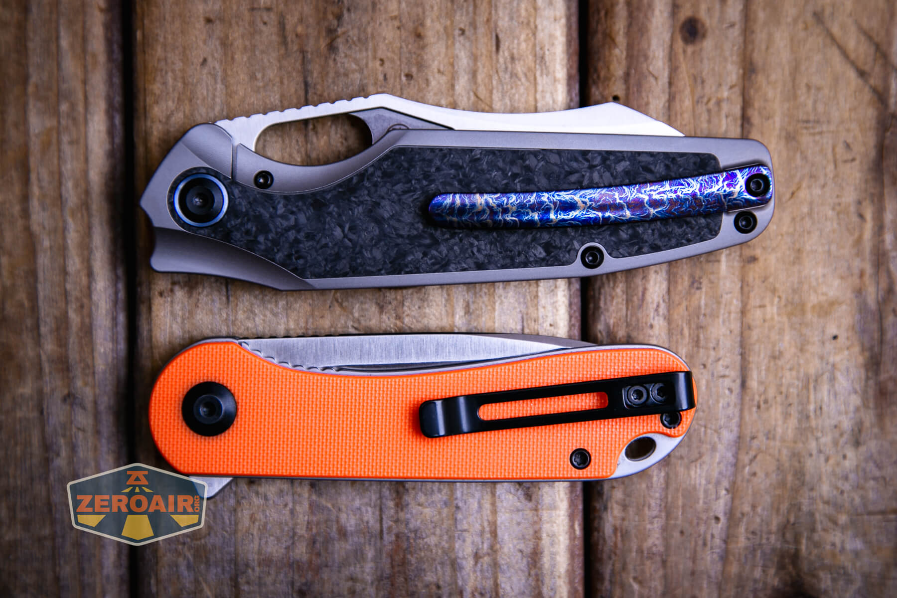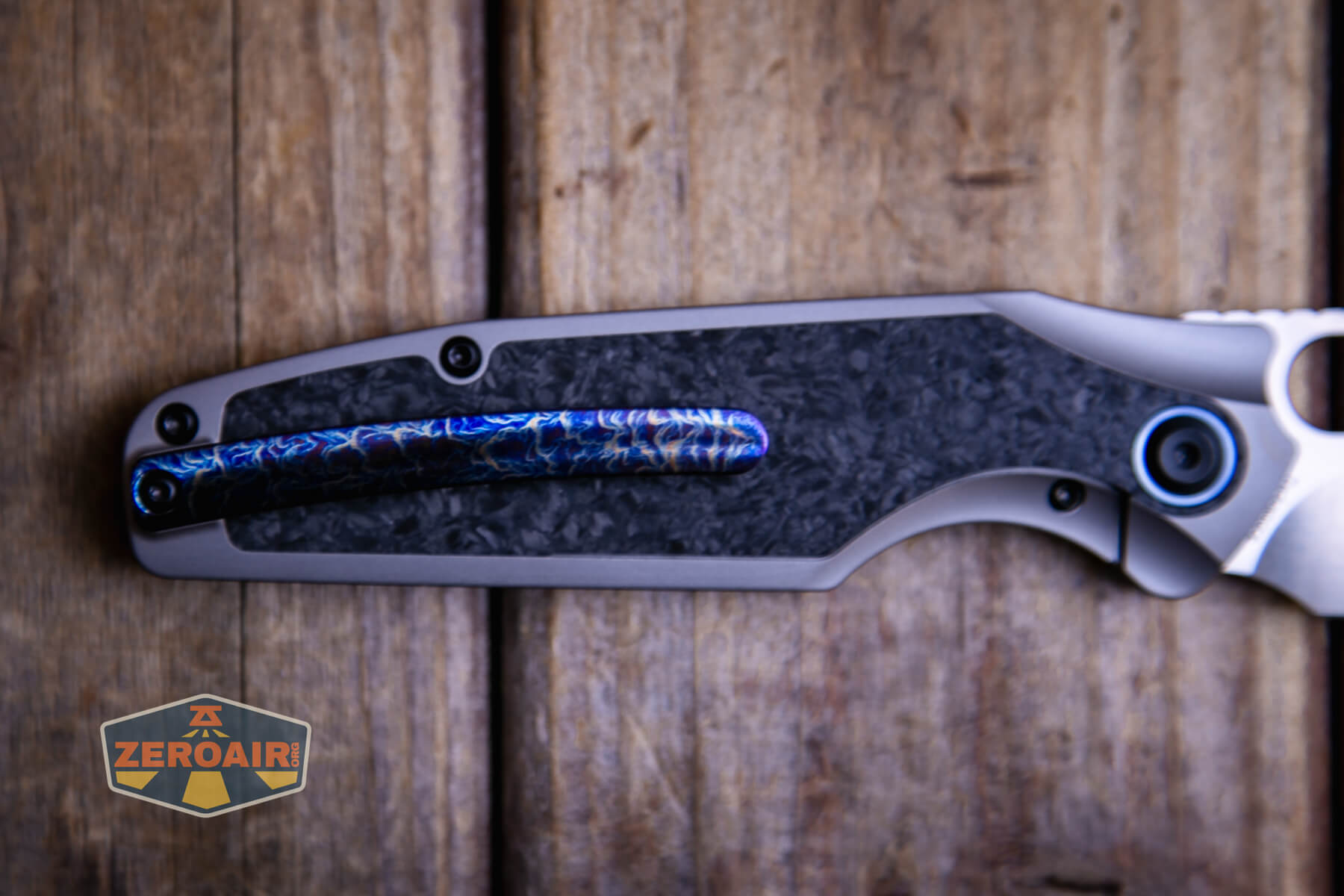 First of all, this is a titanium knife with carbon fiber. But the most prominent (and colorful) part is this pocket clip, which has what appears to be an entropic finish.