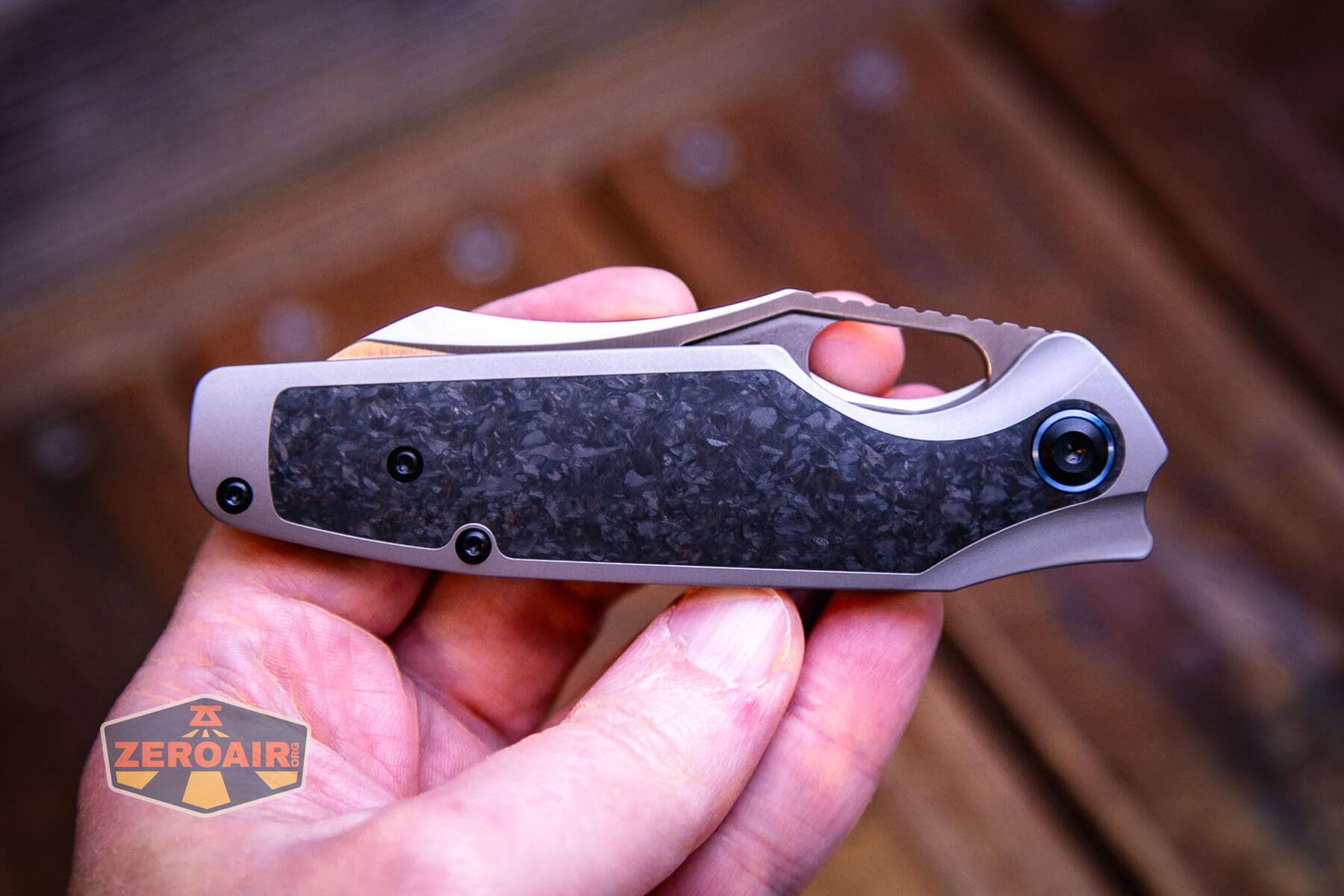 The inlay of this Tuckamore titanium knife is “shred” carbon fiber.
