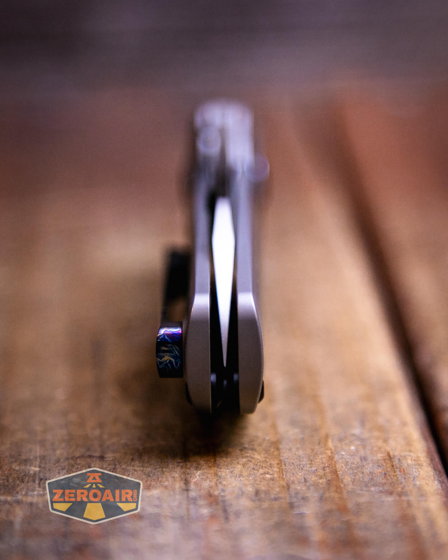 A pocket clip is included and installed on the Kansept Tuckamore titanium knife. The clip itself looks to be titanium and on my review copy, has been finished with a very well-executed entropic heat treatment.