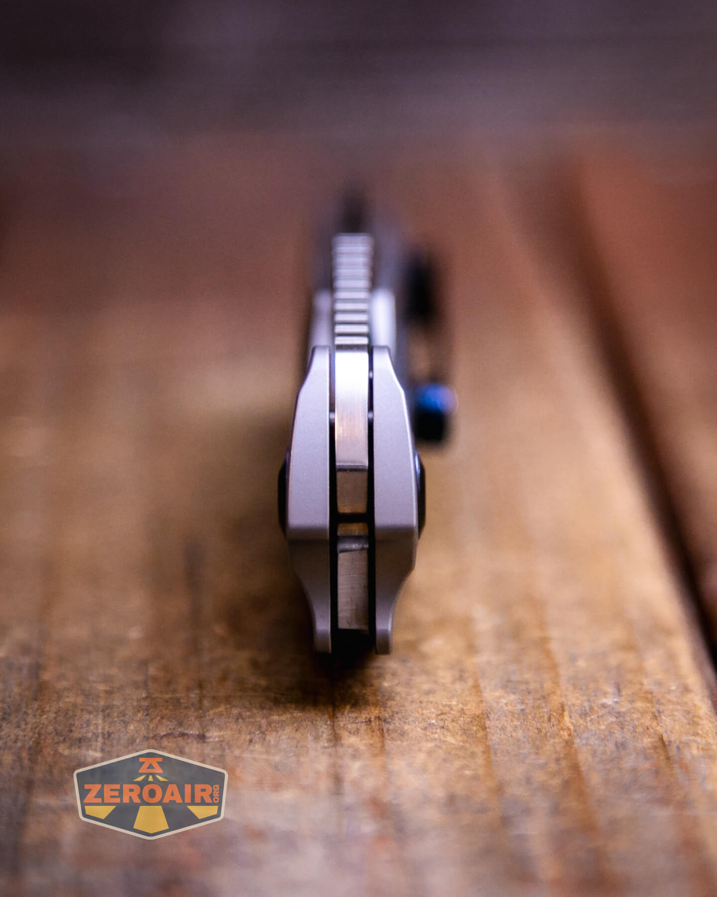 This is a frame lock knife. So once opened, part of the handle leans into place to prevent the blade from rotating closed. Below you can see the frame lock in action – a locked state. There’s also a tiny Torx screw there in the frame lock. I think that is a detent adjustment. In fact (and you can see this below), I think there’s a little inset piece (probably stainless, and not titanium) that can be adjusted via this screw, to affect the lockout. (There’s really no manual to cover this information, and there are a number of things that screw could actually do, so if you have different information, let me know!)