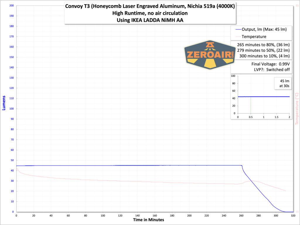 Below you can see a number of runtime tests. This is approximately what was observed in the titanium light, but output is sustained much better in the aluminum. That makes sense!