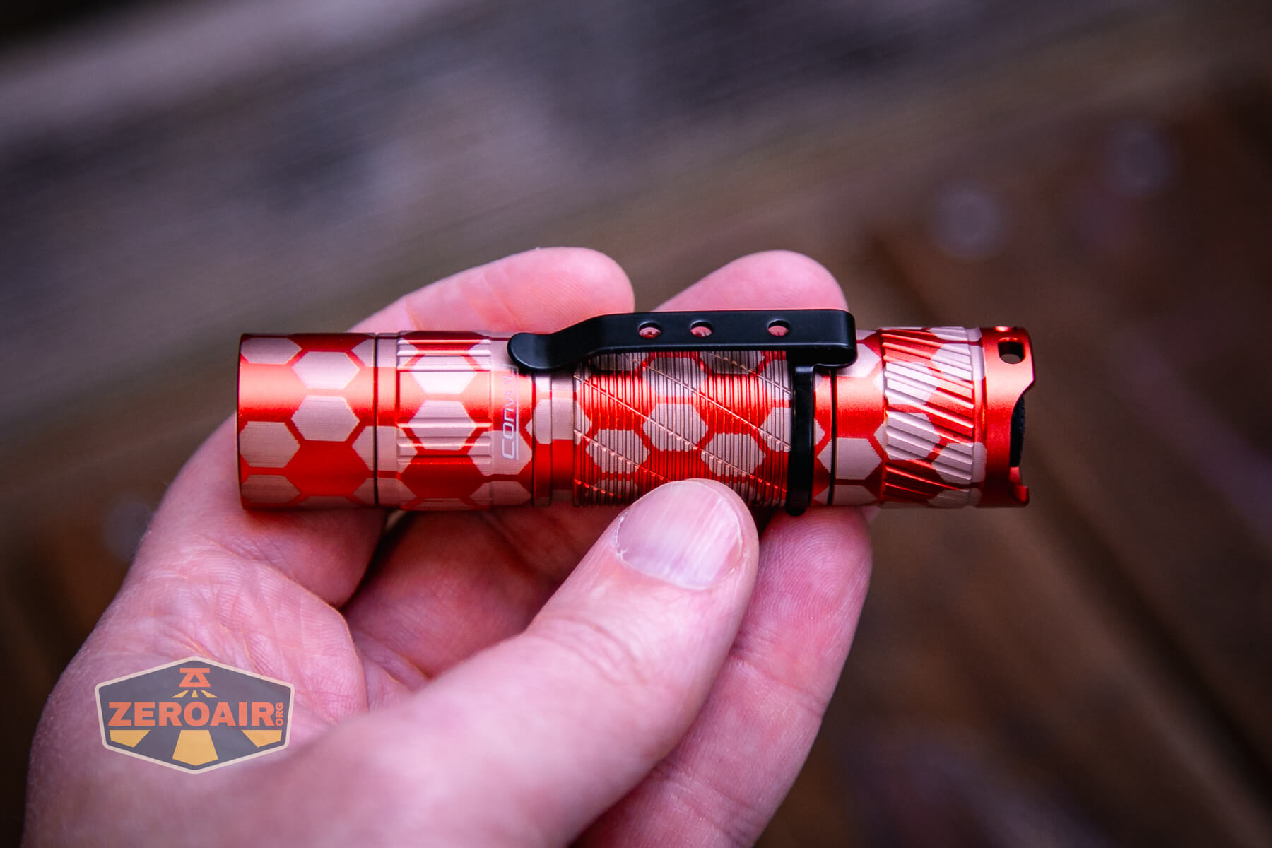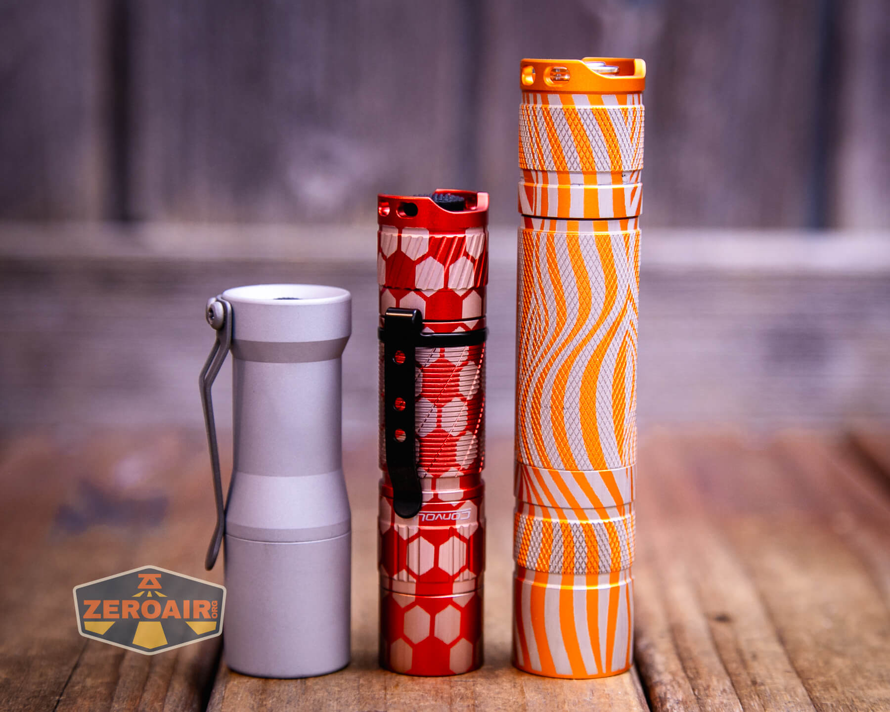 There is plenty to love about the Honeycomb Engraved Convoy T3. Very importantly, the T3 runs on both AA (that is, 1.5V) cells as well as the higher-output-capable lithium-ion 14500 cell. Also the honeycomb laser accents added by GadgetConnections are great! I think this is the best iteration, really.