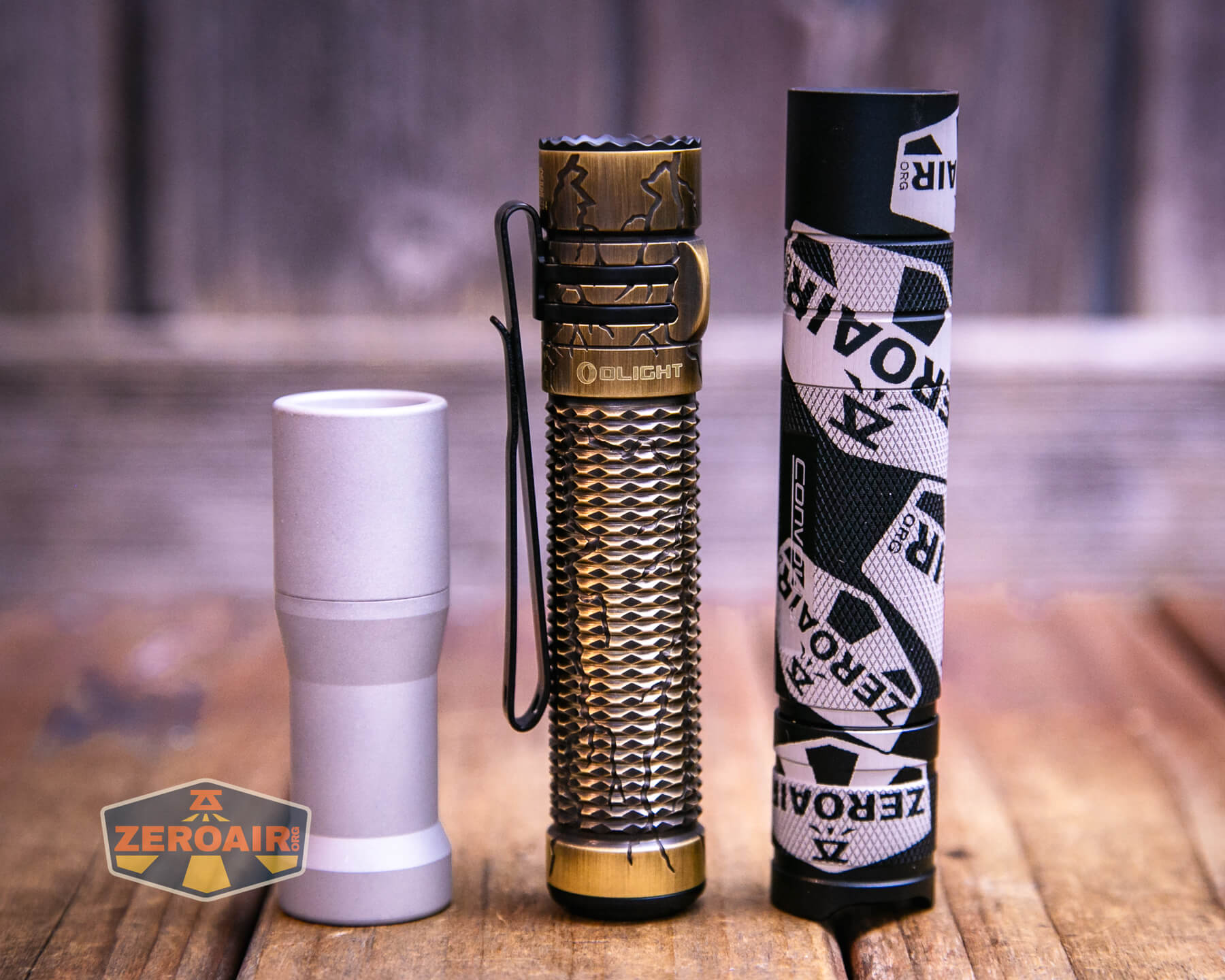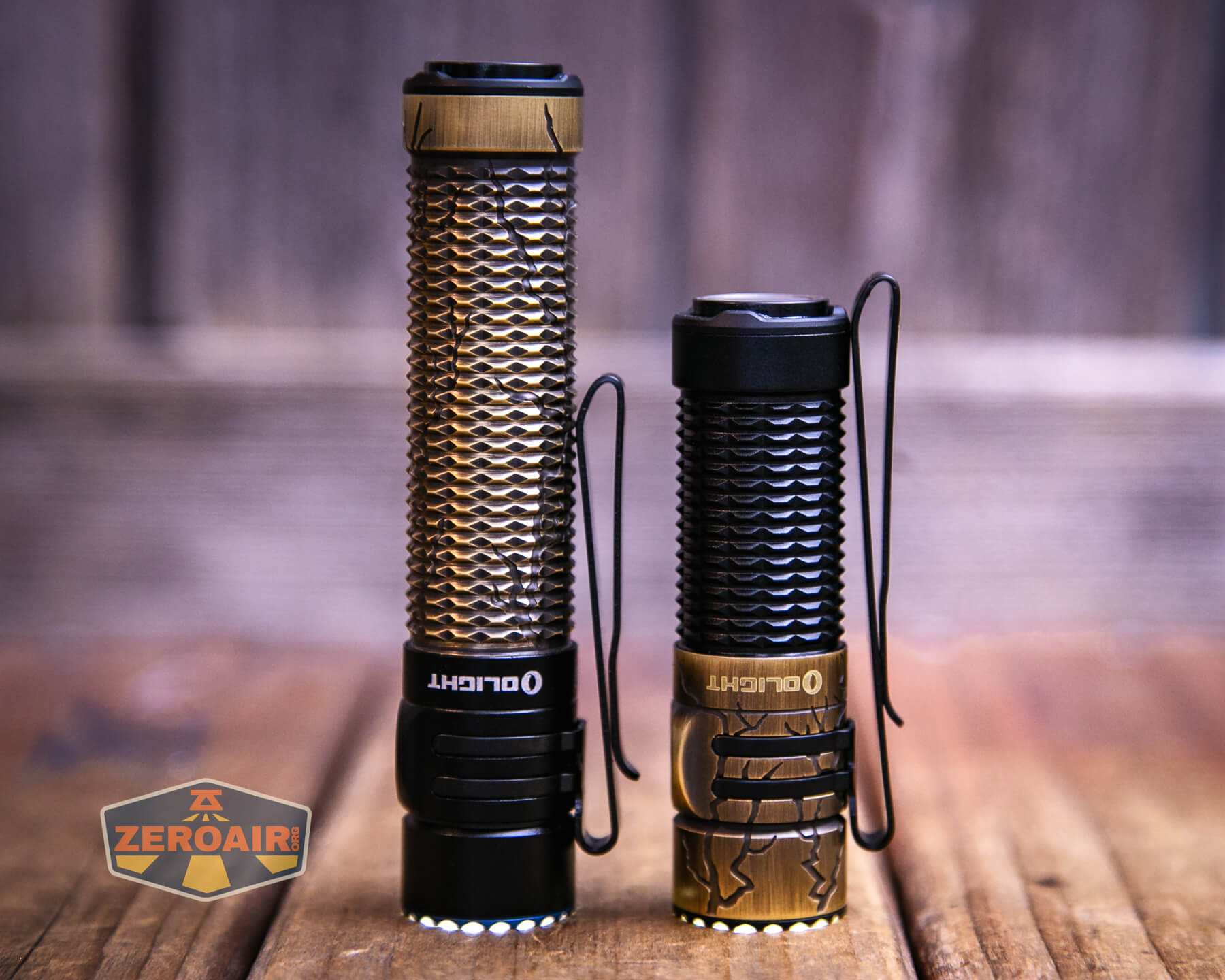 Here’s this Olight Warrior Mini 3 Cracked brass with the (just released!) Olight Warriot Nano, which I reviewed. The Nano is still on the introductory price, so go grab it now!!