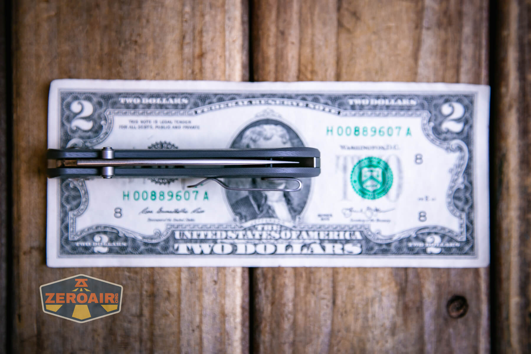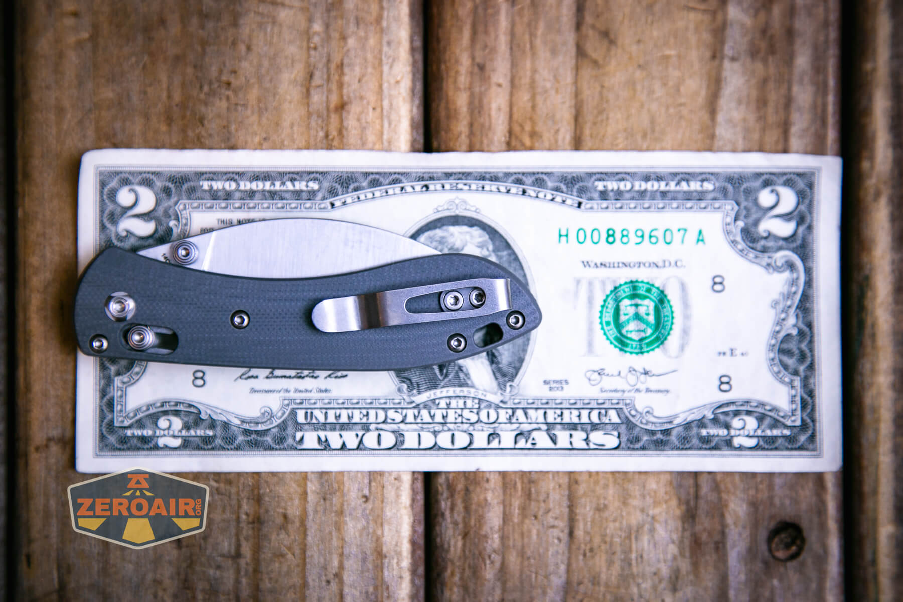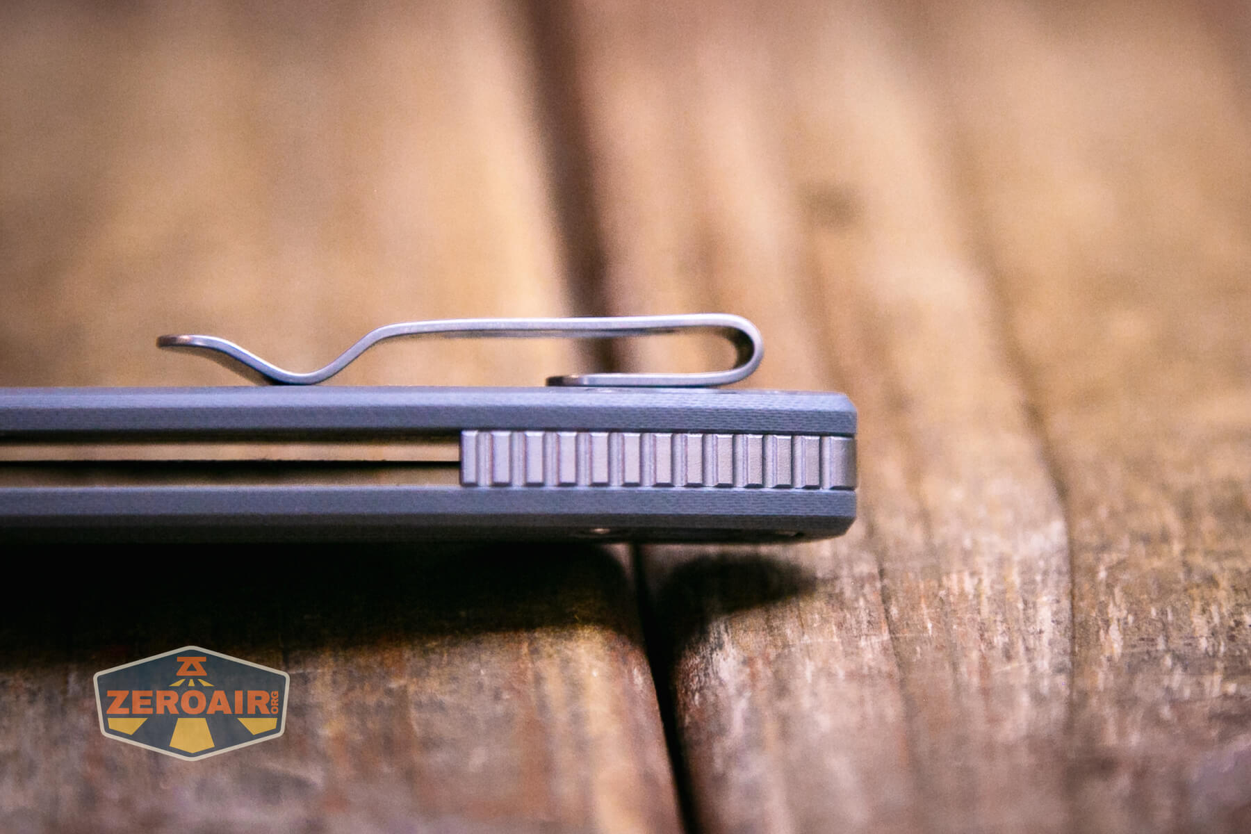 As stated above, the pocket clip is a nice deep carry clip. The clip is held in place by two “over/under” TORX screws (around T6, I think). The clip can not be moved to any other position but what you see below. That does probably mean the knife will be backward for you southpaws out there!