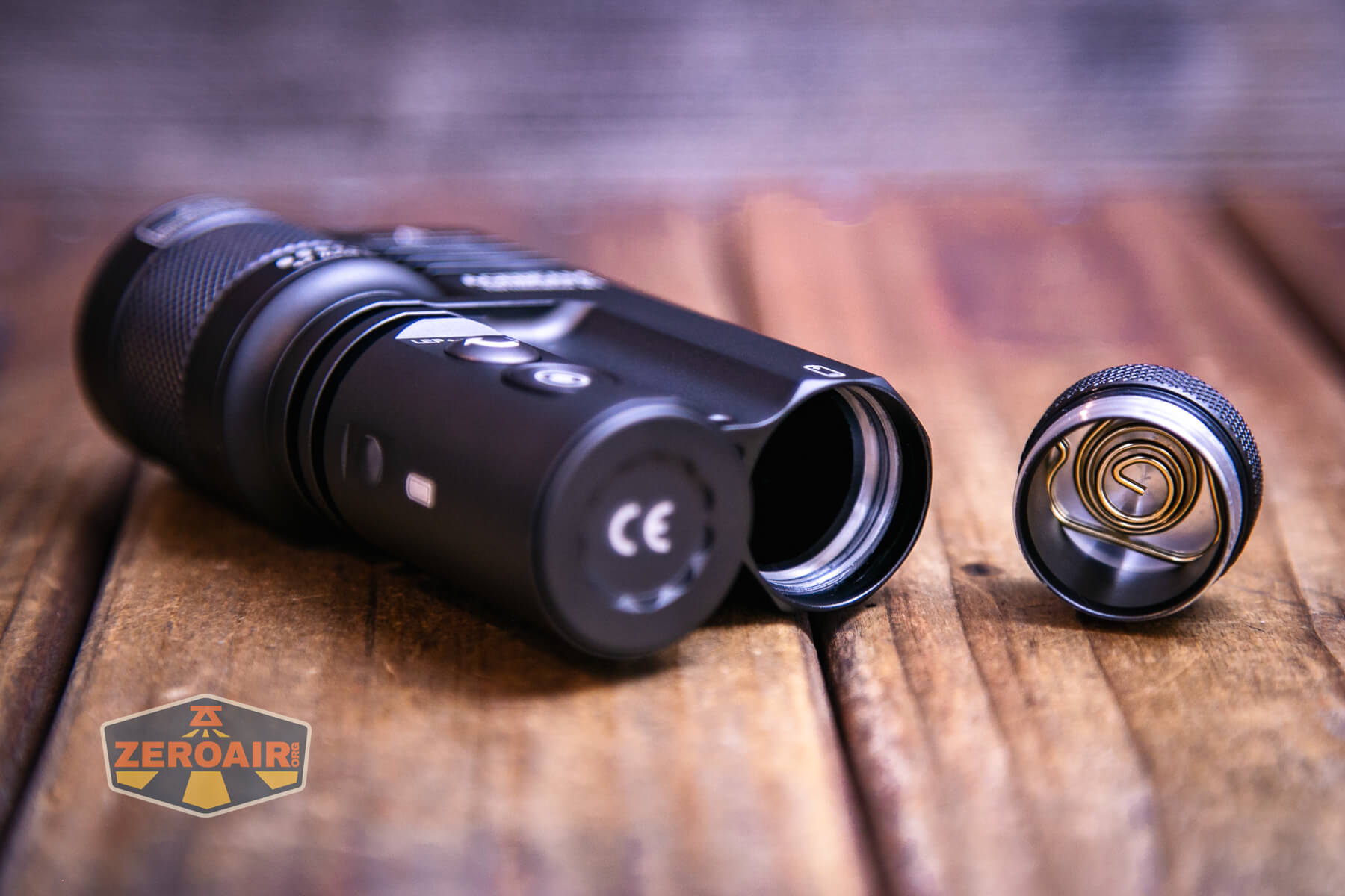 Here you can see the tailcap or tailcaps. The right side is the LED side, and also where the included 21700 fits. The left side has both switches as well as the LEP module, which is apparently fairly (or at least comparatively) large.