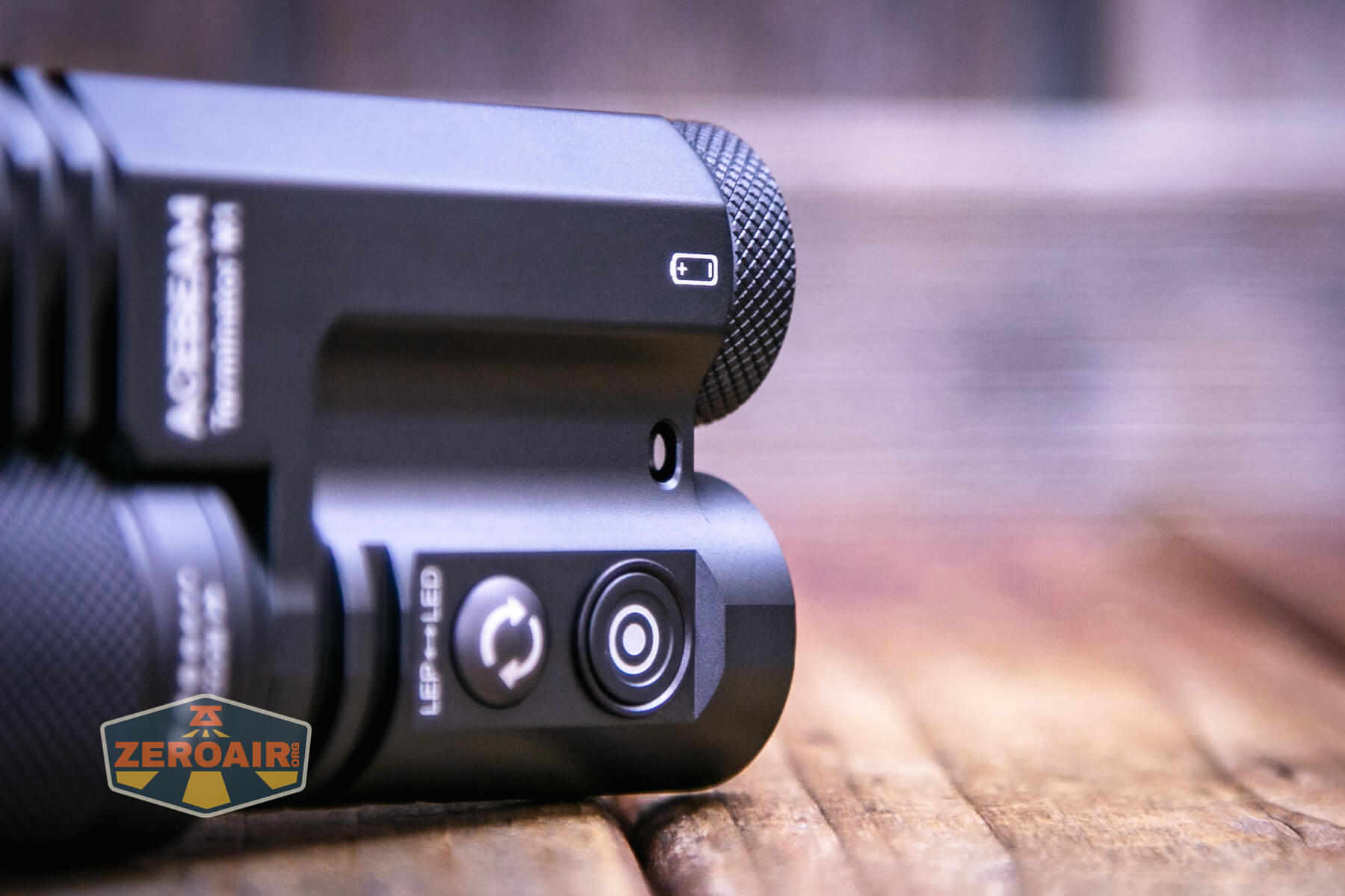 There are a couple of switches on the Acebeam Terminator M1 flashlight. The bottom one (with the Target symbol) is the on/off and mode switch. The upper (domed) switch is only for switching between LEP and LED output.