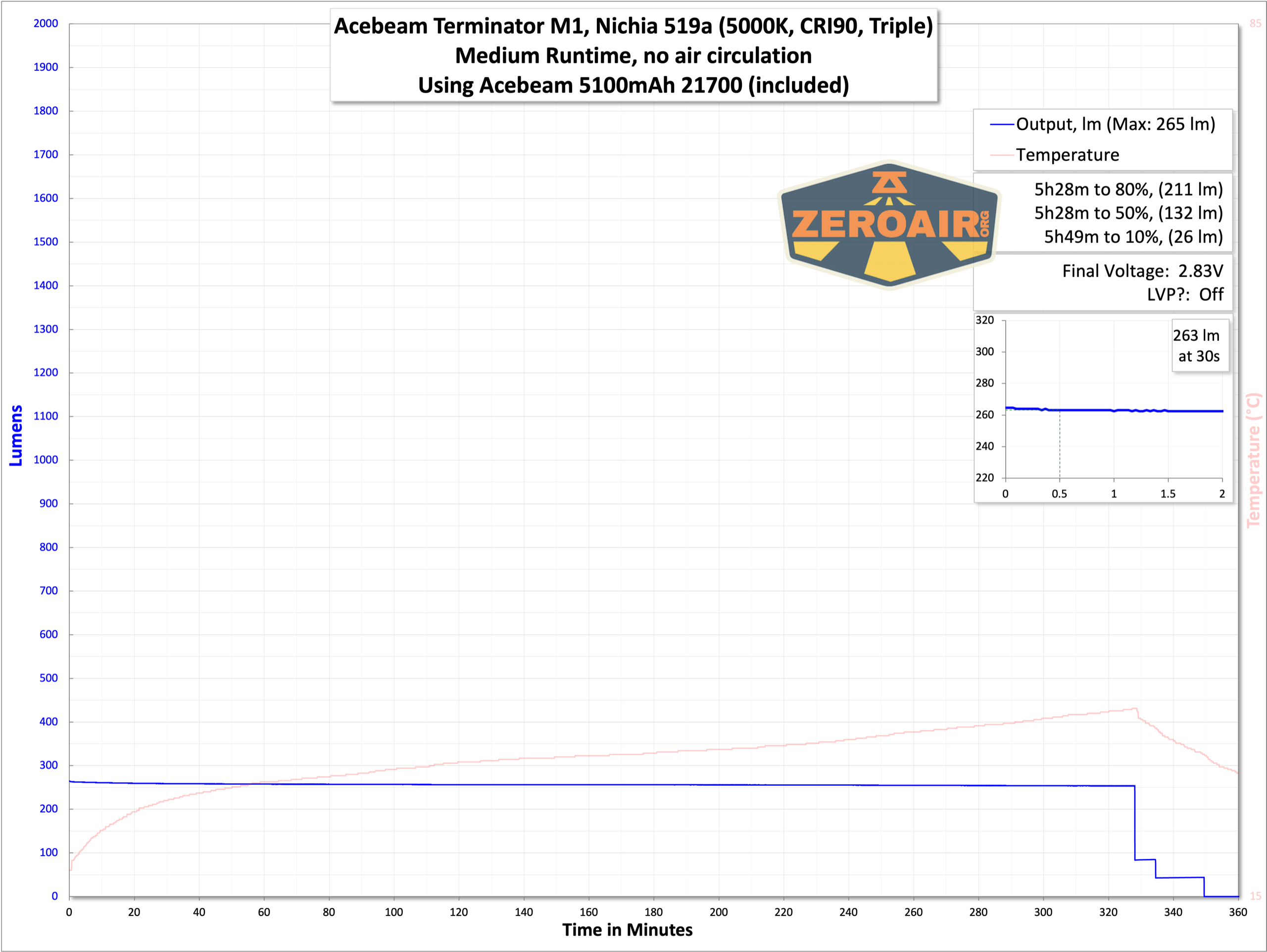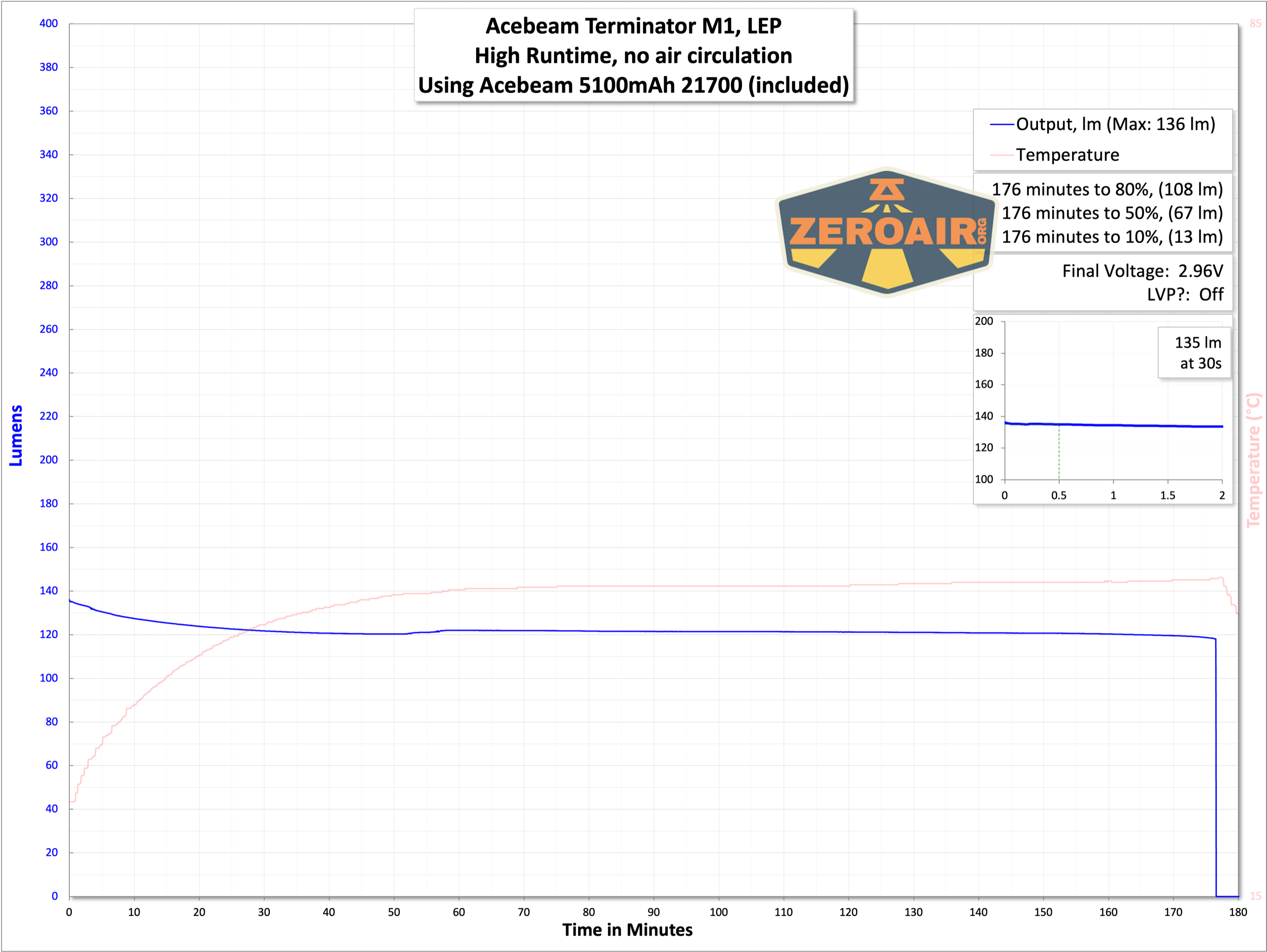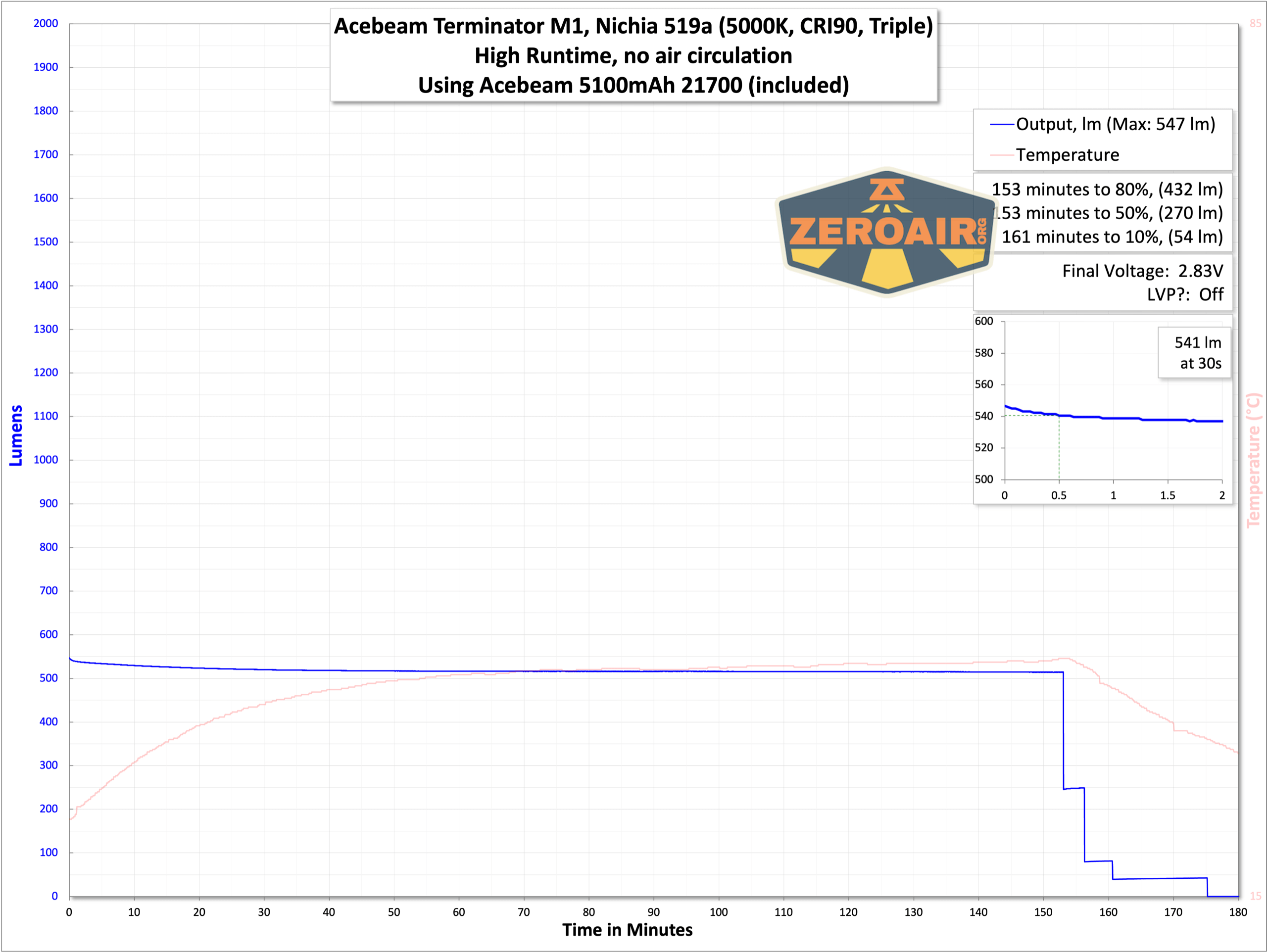 Output is very nice and flat at around 550 lumens, for well over 2 hours.