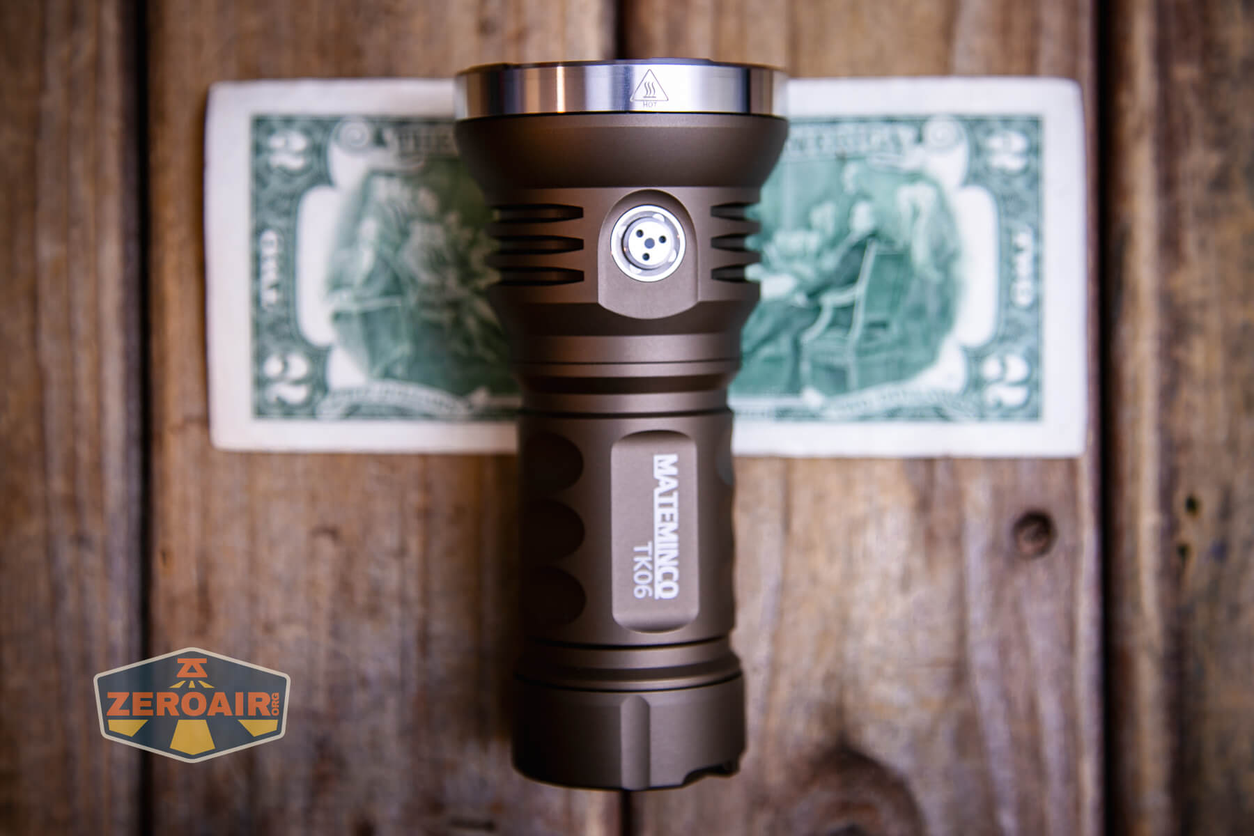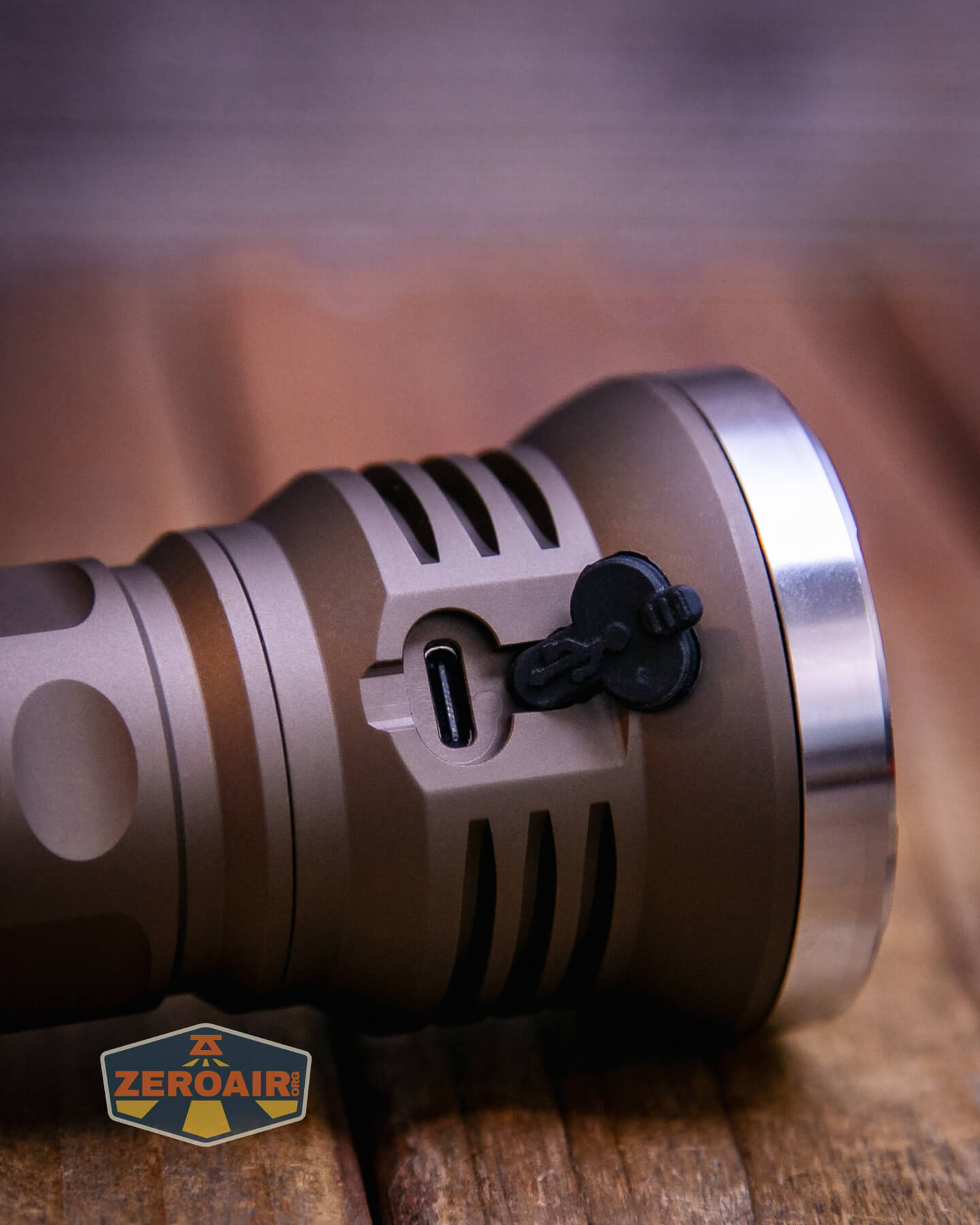 The Mateminco TK06 flashlight with laser offers onboard charging by way of a USB-C port on the head. The press-in cover seems very secure, and in fact, might even require a longer fingernail to lift up.