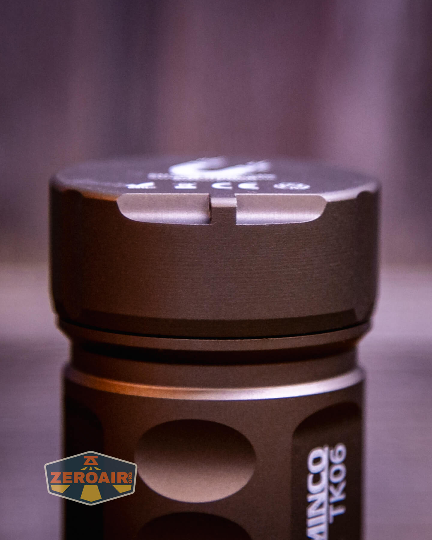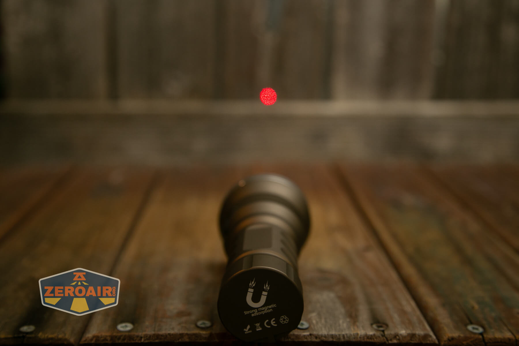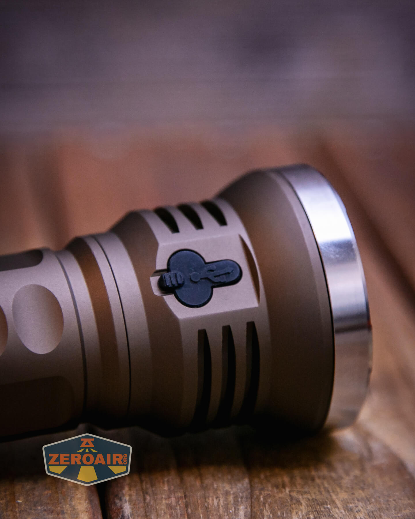 The Mateminco TK06 flashlight with laser uses one switch for controlling all of the many options. Two emitter options, including a third that mixes those two, and a red laser – it’s a lot. The switch itself is fantastic! It’s a metal-covered e-switch and has four holes that allow indicating information through.