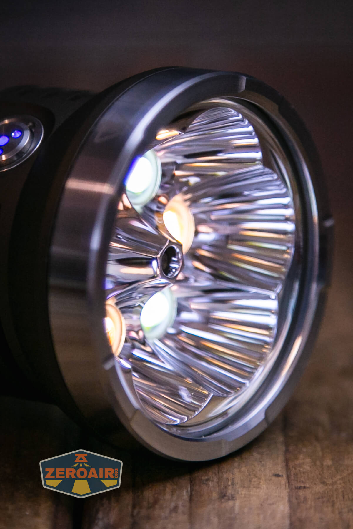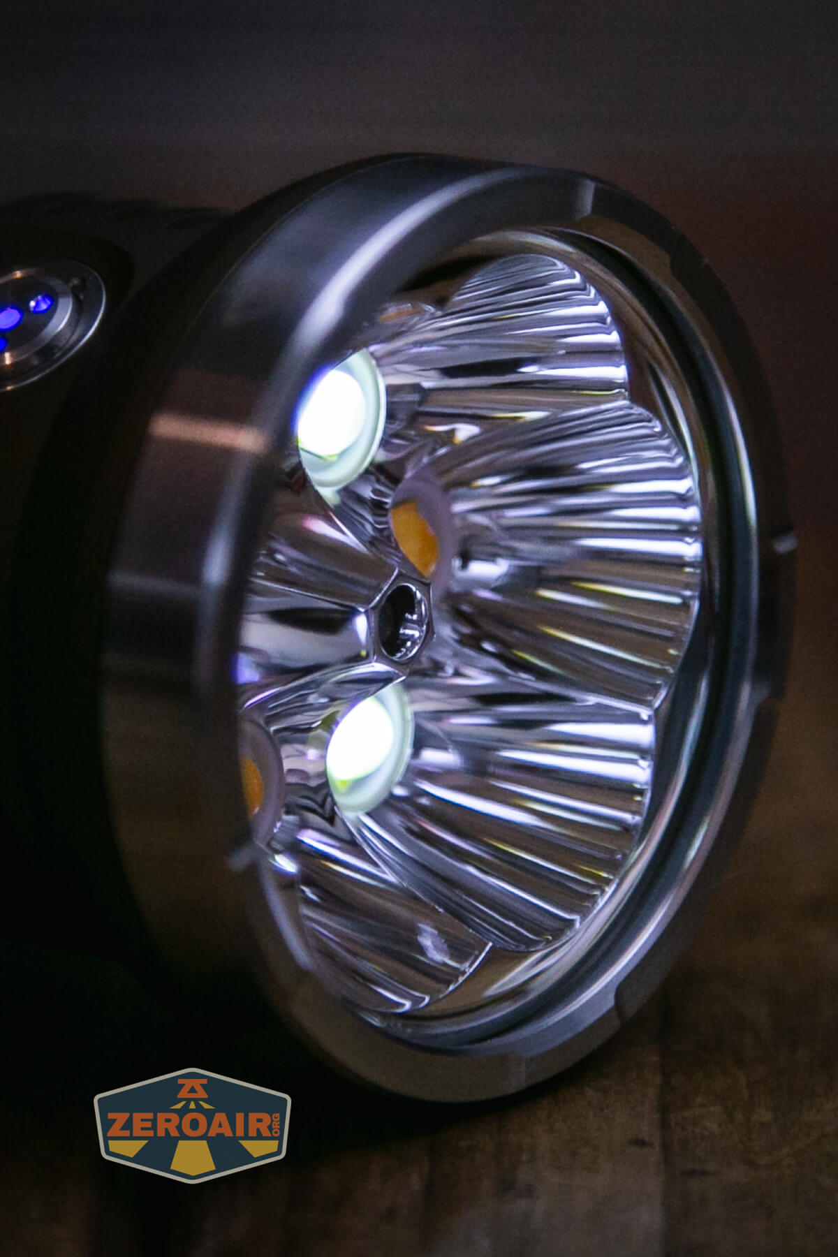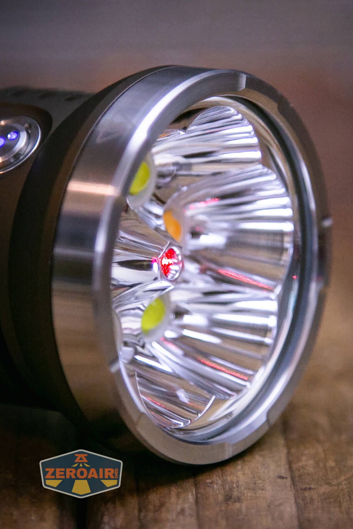 The emitters can be used by color separately or together. Below you can see just the three warm white emitters lit. The laser can’t be used while the emitters are on.