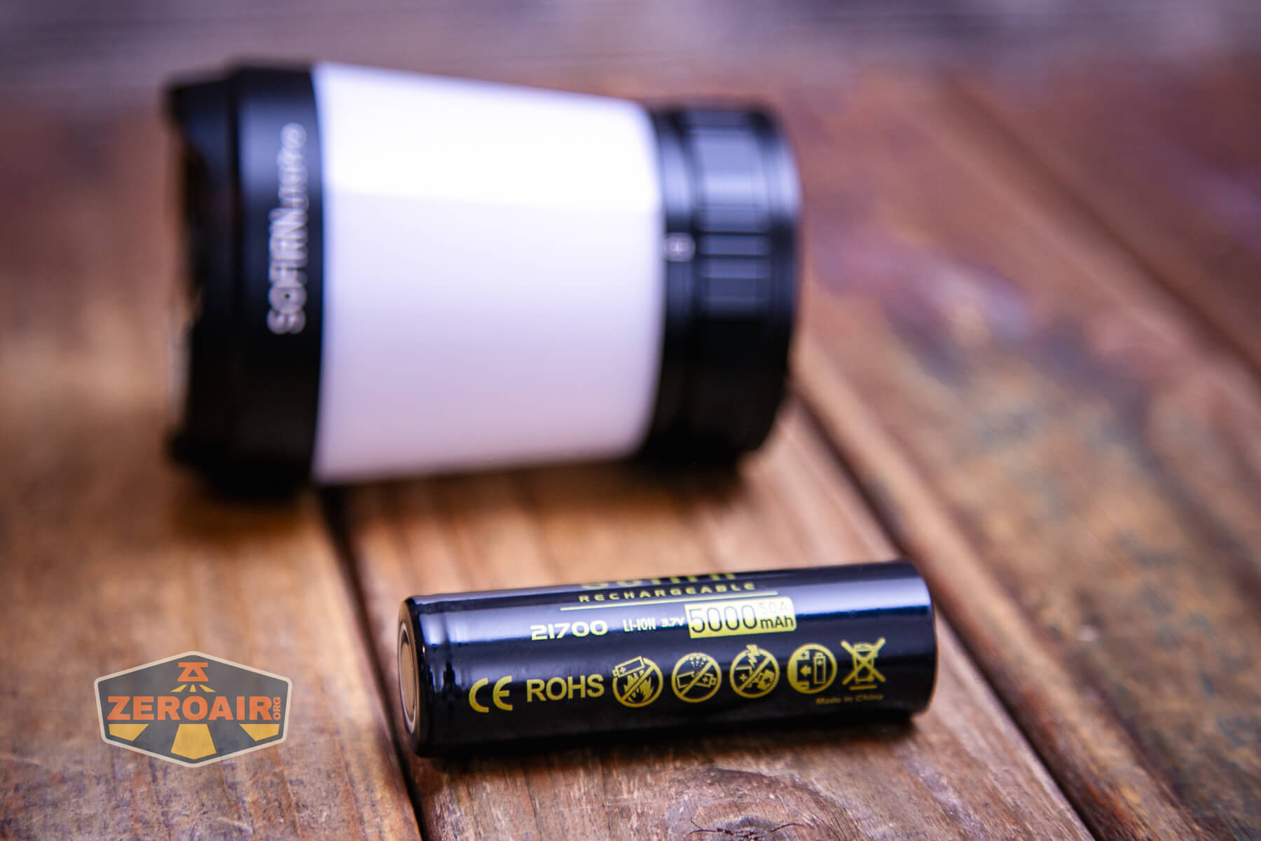The Sofirn LT1S Pro camping lantern is powered by a single lithium-ion battery. If you go for the package deal, you’ll get the 5000mAh 21700 seen below.