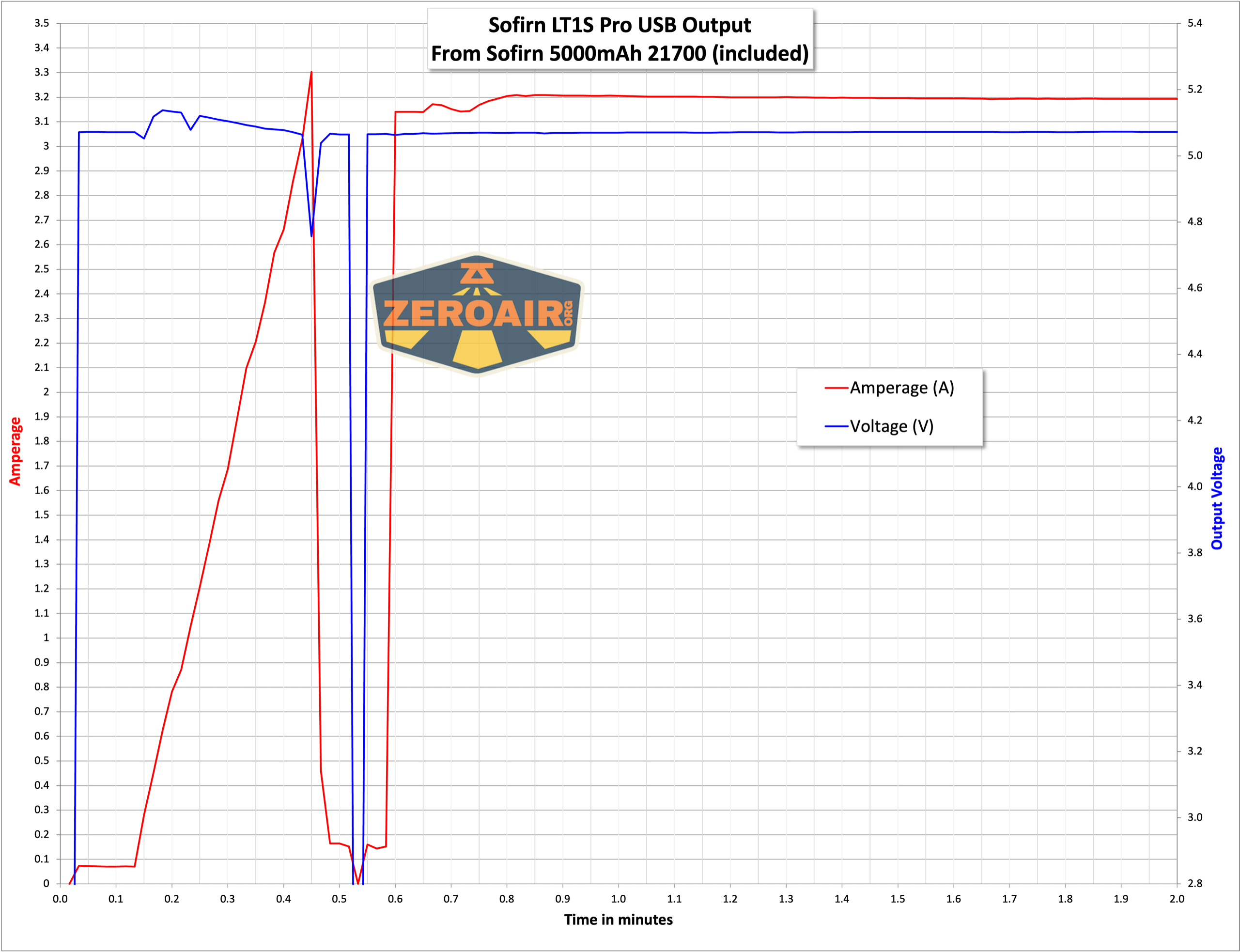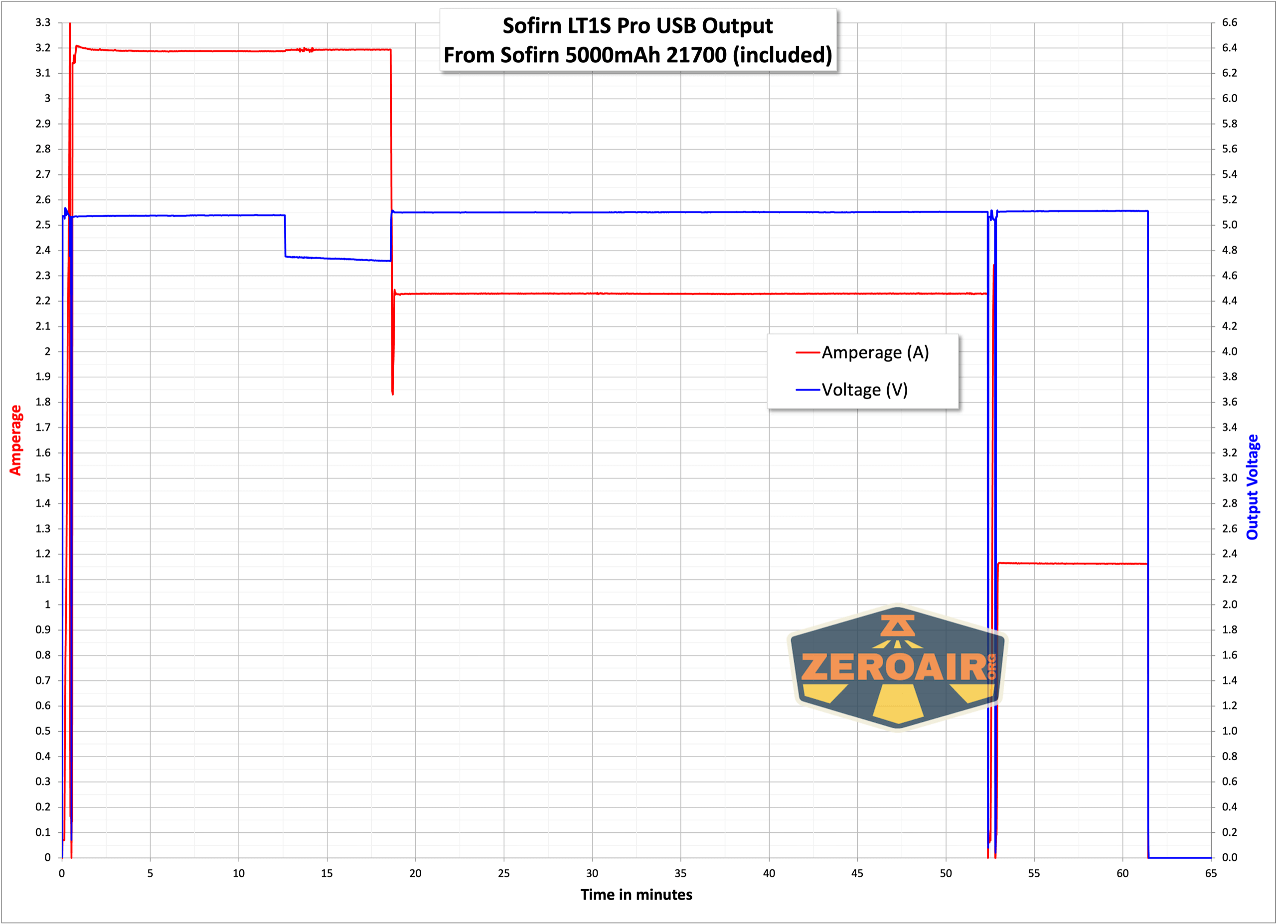 The powerbank feature on the LT1S works great, too! I did a sort of “stress test” on the output – run at the highest level where it stays at around 5V until it shuts off, then repeat at the next lower level. The USB-C port can output over 3A at 5V, which is very good. After that shuts off, you can cycle the port and get 2A for a while, then 1A for a while. Just unplug/plug your device. Here are a couple of graphs!