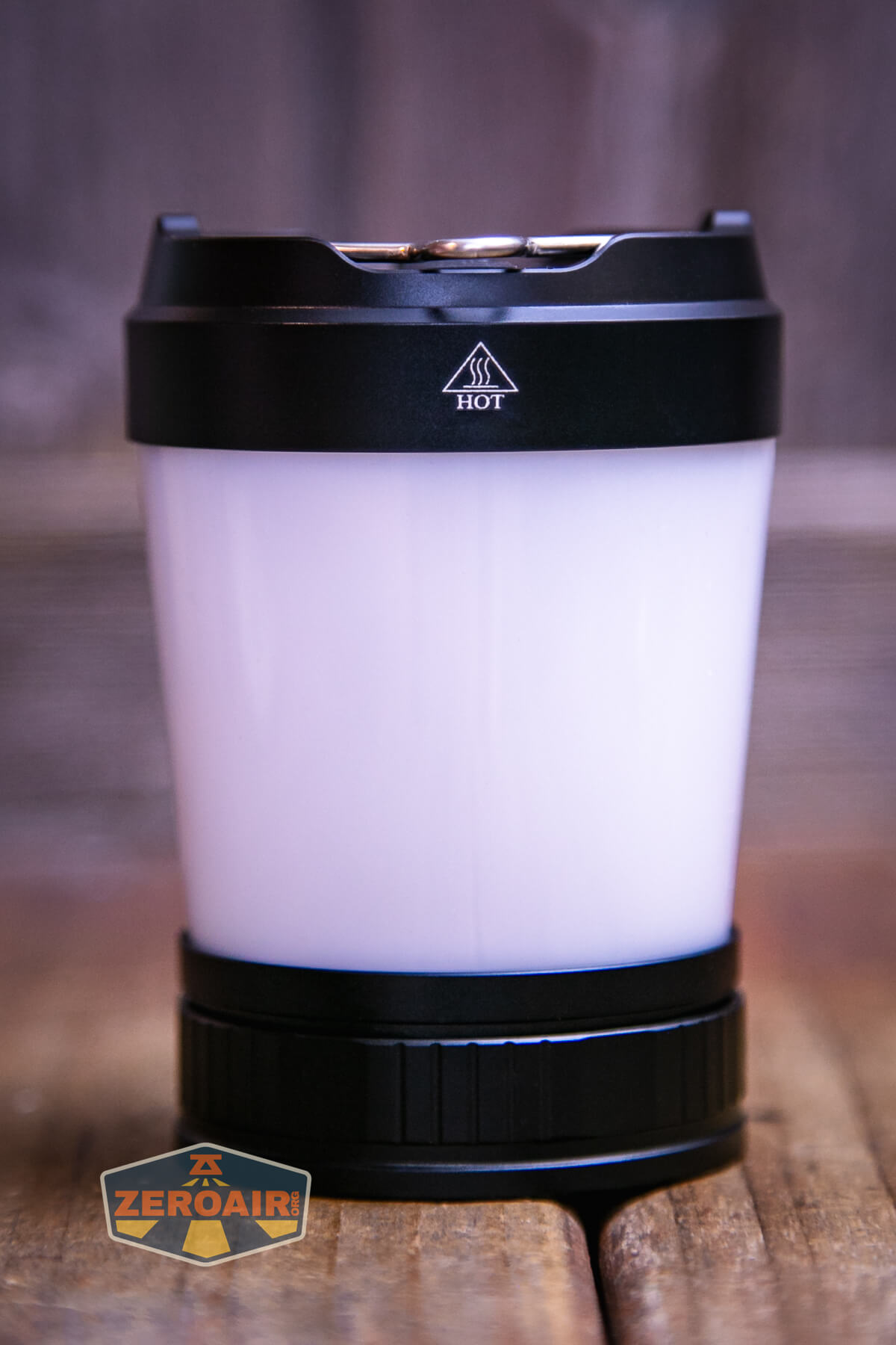 A single switch controls the Sofirn LT1S Pro camping lantern. That e-switch is on the top of the lantern and is covered by a knurled rubber boot.