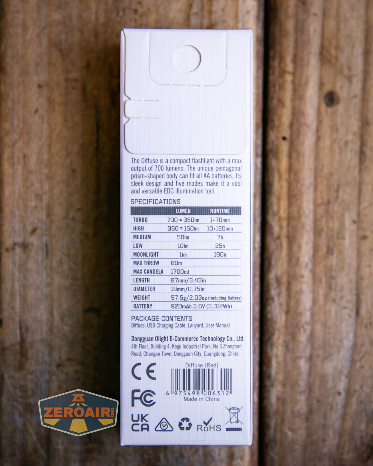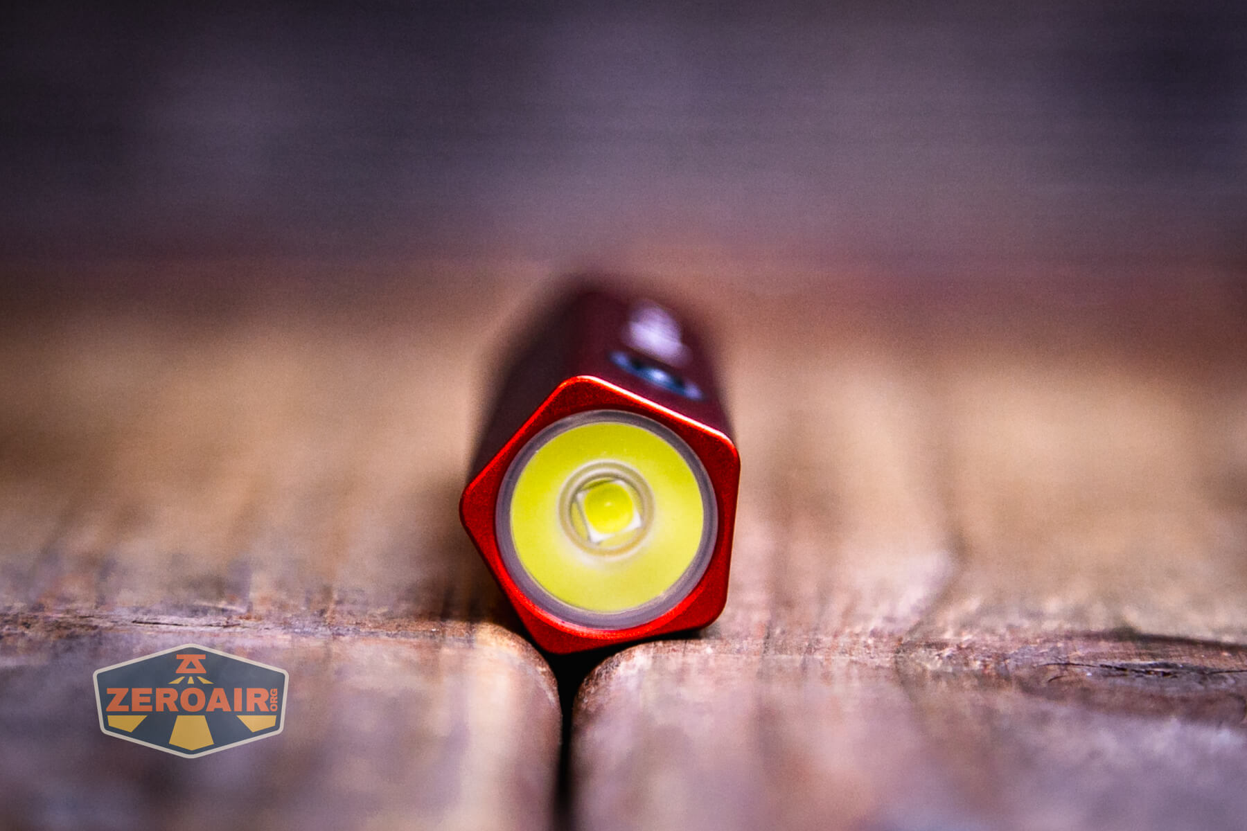 Olight doesn’t say what emitter is used in the Diffuse. There’s a TIR optic, too. Despite having a pentagonal body shape, the optic is a circle.