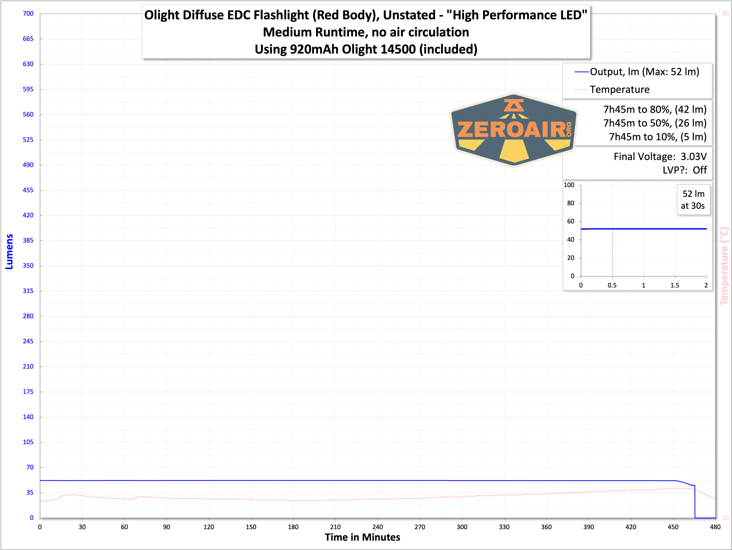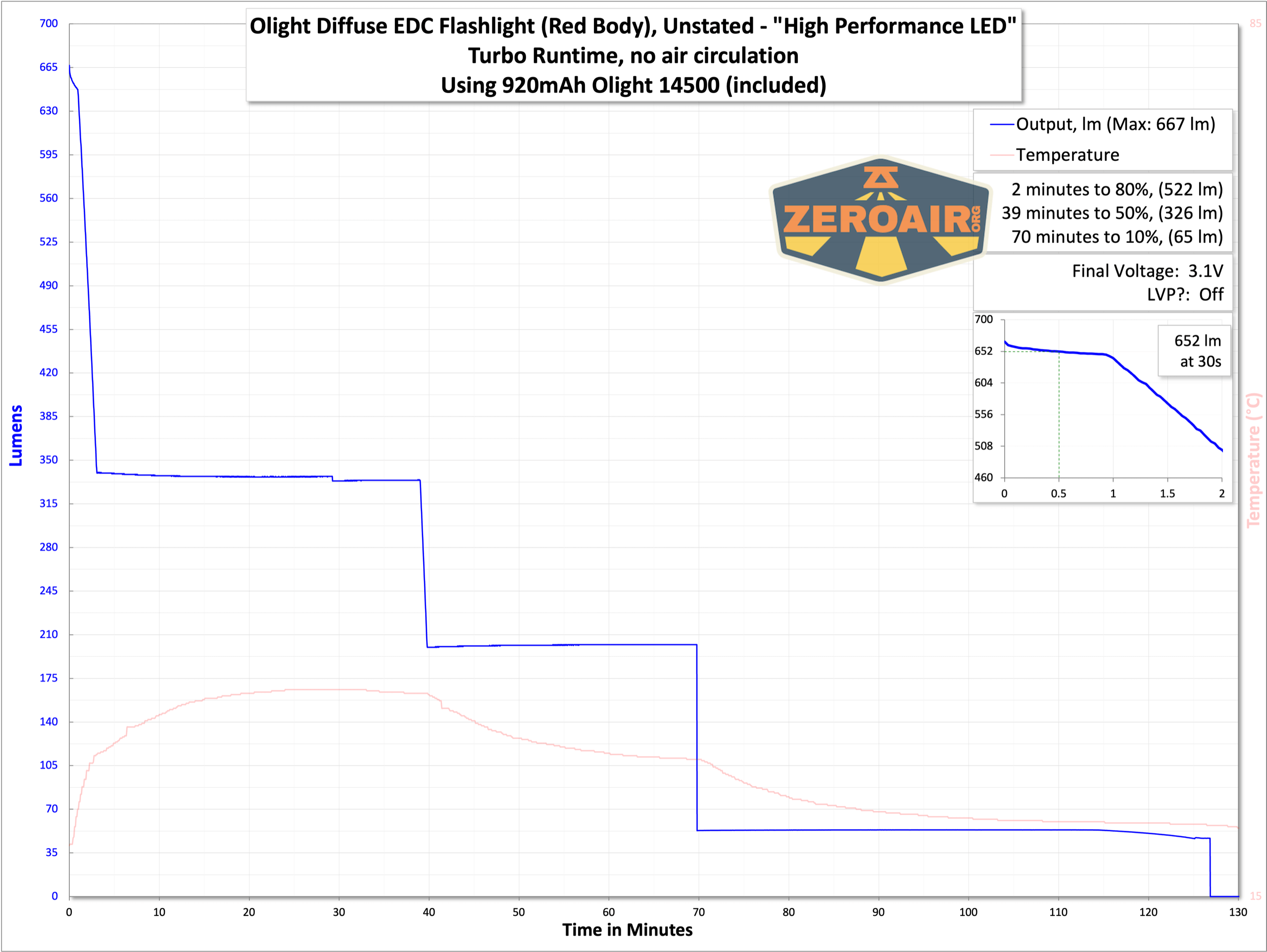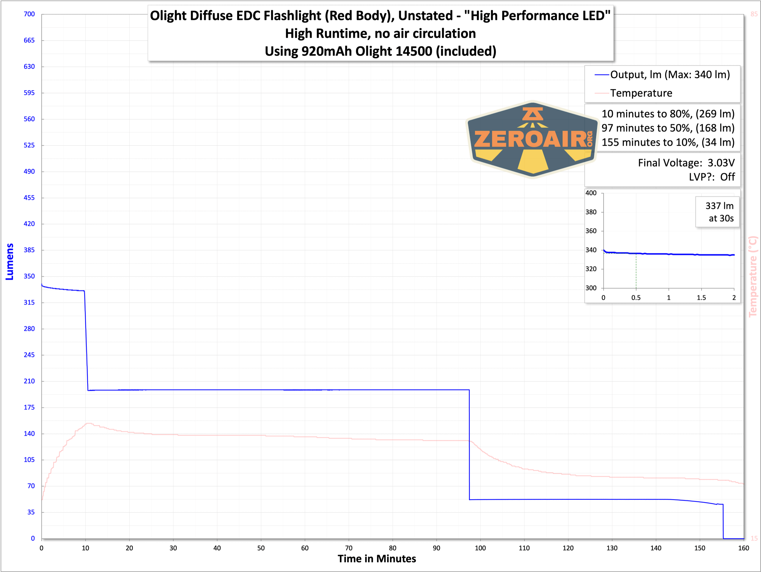 Included with the Diffuse is a 14500 lithium-ion cell, with 920mAh capacity. It’s a fine cell.