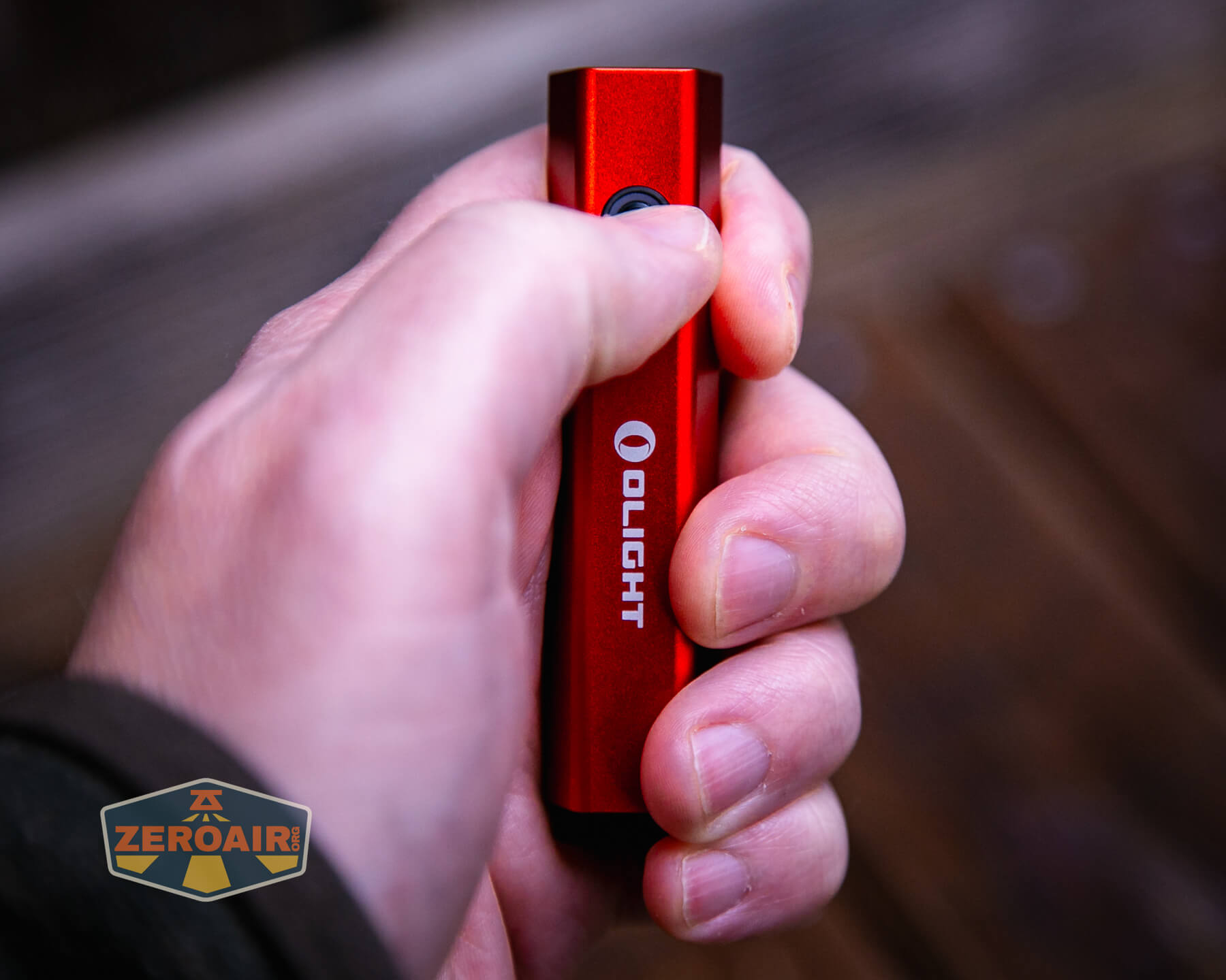 One unusual feature of the Olight Diffuse EDC pocket flashlight is the pentagonal shape. There are five flat sides here! That’s neat. It’s very anti-roll!