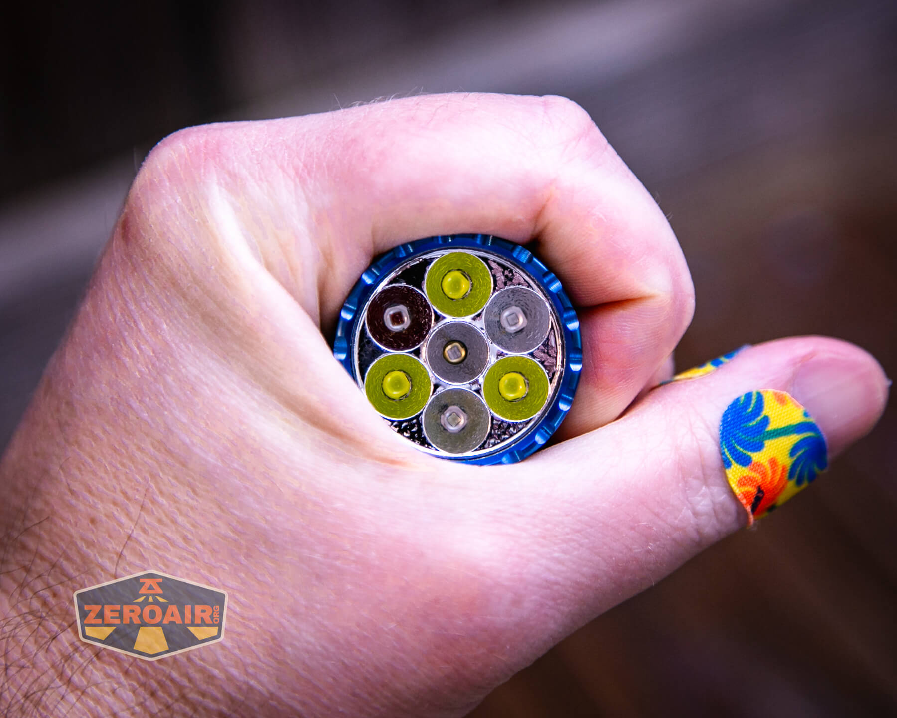 In this higher output version, Skilhunt has used three Cree XP-G4 emitters. They’re cool white, and like all of the other emitters, have a small orange peel reflector. There are a total of four emitter varieties here: white (Cree XP-G4, 6500K), Red, Green, Blue, and UV. The UV is dead center. The light ships with a little UV filter and the reflector for UV has a little lip where this filter sits. That’s a nice touch by Skilhunt and well-considered. (Also shipping this way seems to prevent some notable patent issues…)