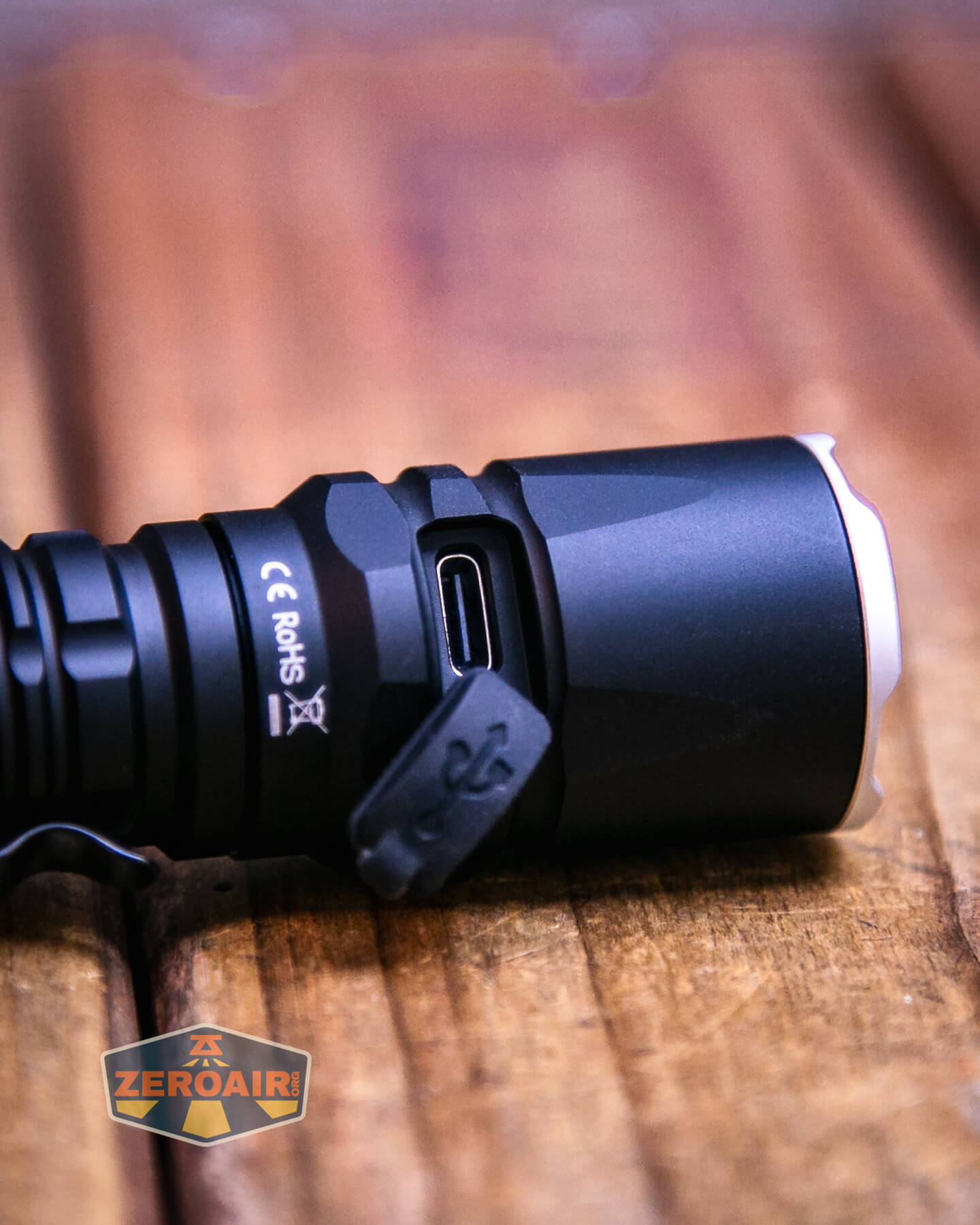 The Wurkkos TD03 tactical flashlight offers USB-C charging. The charge port is in the head and has a press-in cover.